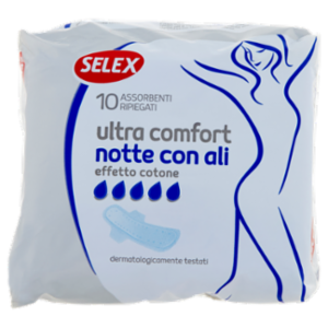 Selex Ultra Comfort Notte con Ali più lungo per tutti i giorni del ciclo in soli 2 mm di spessore garantisce assorbenza e comfort. Grazie alla forma allungata è ideale per i flussi particolarmente abbondanti e per la protezione notturna. Le comode ali ed il filtrante in tessuto non tessuto offrono protezione, igiene e sensazione di asciutto.