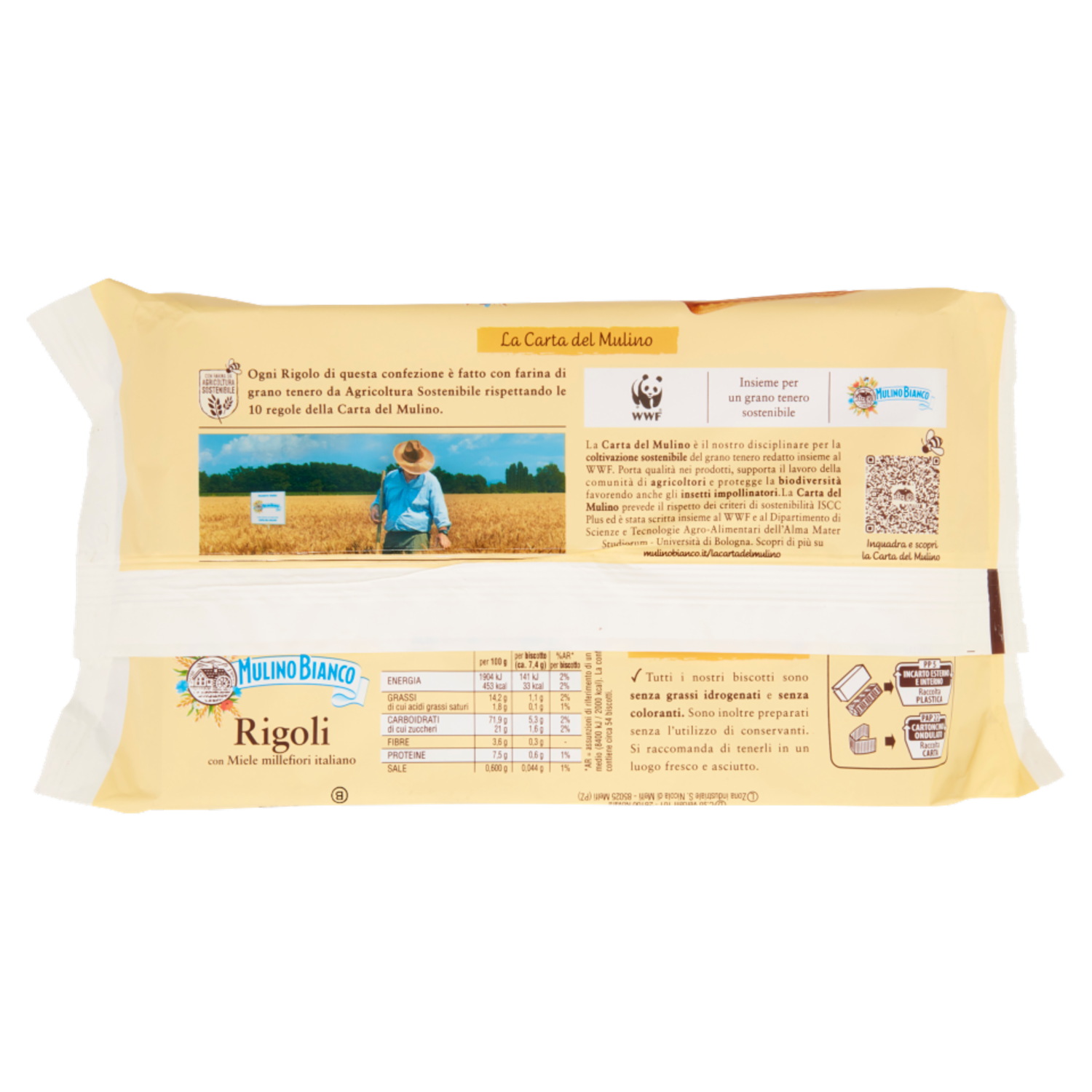 La Carta del Mulino Con farina da agricoltura sostenibile Ogni Rigolo di questa confezione è fatto con farina di grano tenero da Agricoltura Sostenibile rispettando le 10 regole della Carta del Mulino. Insieme per un grano tenero sostenibile La Carta del Mulino è il nostro disciplinare per la coltivazione sostenibile del grano tenero redatto insieme al WWF. Porta qualità nei prodotti, supporta il lavoro della comunità di agricoltori e protegge la biodiversità favorendo anche gli insetti impollinatori. La Carta del Mulino prevede il rispetto dei criteri di sostenibilità ISCC Plus ed è stata scritta insieme al WWF e al Dipartimento di Scienze e Tecnologie Agro-Alimentari dell'Alma Mater Studiorum - Università di Bologna. Scopri di più su mulinobianco.it/lacartadelmulino Il buono che non vedi - Tutti i nostri biscotti sono senza grassi idrogenati e senza coloranti. Sono inoltre preparati senza l'utilizzo di conservanti. Si raccomanda di tenerli in un luogo fresco e asciutto.