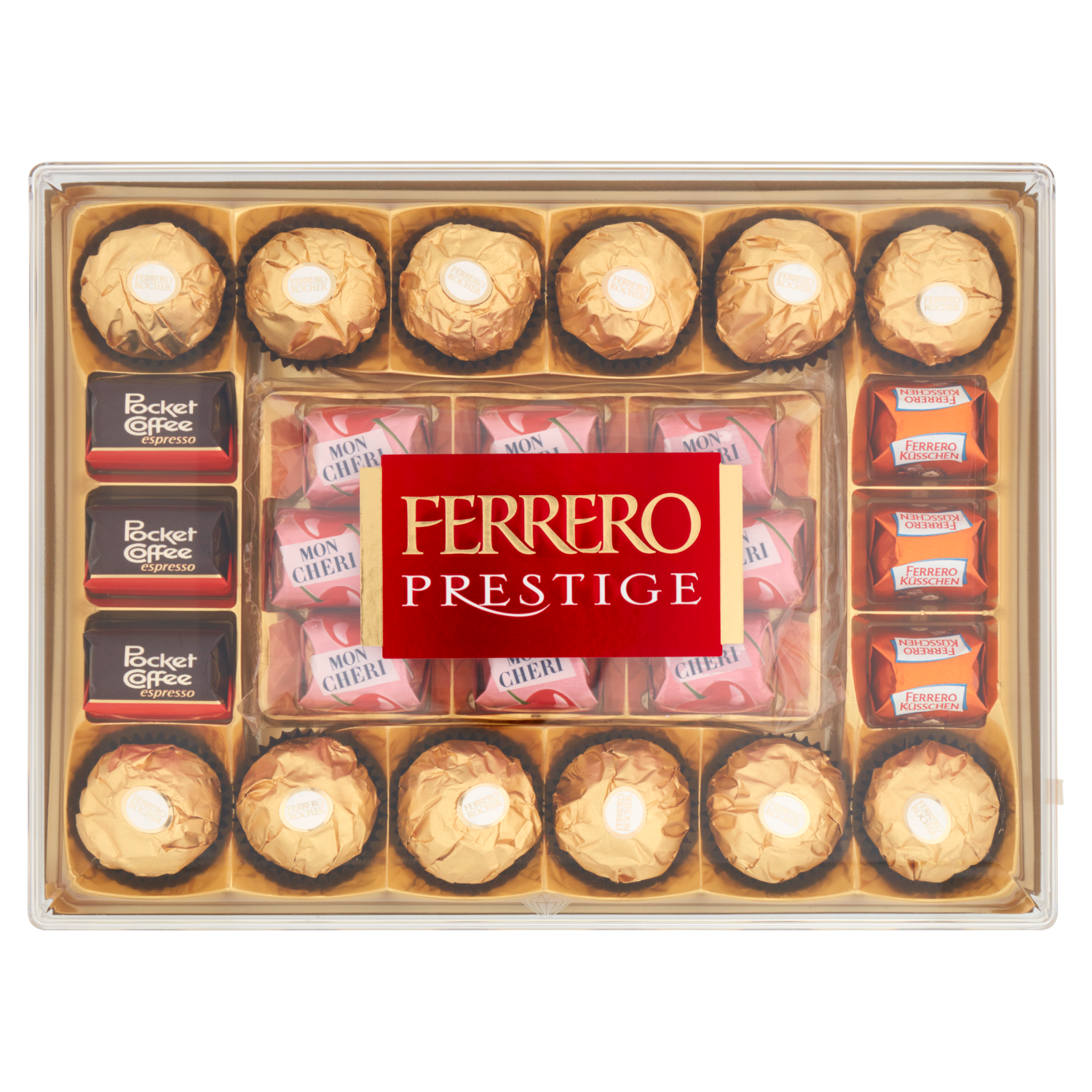 Mon Chéri - Praline di cioccolato extra con ciliegia e liquore Pocket Coffee - Praline di cioccolato extra e cioccolato finissimo al latte ripiene di vero caffè liquido Ferrero Rocher - Croccanti specialità al cioccolato al latte con nocciole e ripieno cremoso con nocciola intera Ferrero Küsschen - Praline con copertura di cioccolato al latte e cioccolato extra, con ripieno alla nocciola e nocciola intera