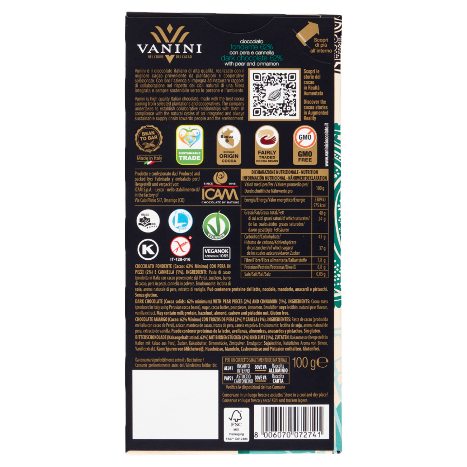 Cioccolato fondente (Cacao: 62% Minimo) con pera in pezzi (2%) e cannella (1%)