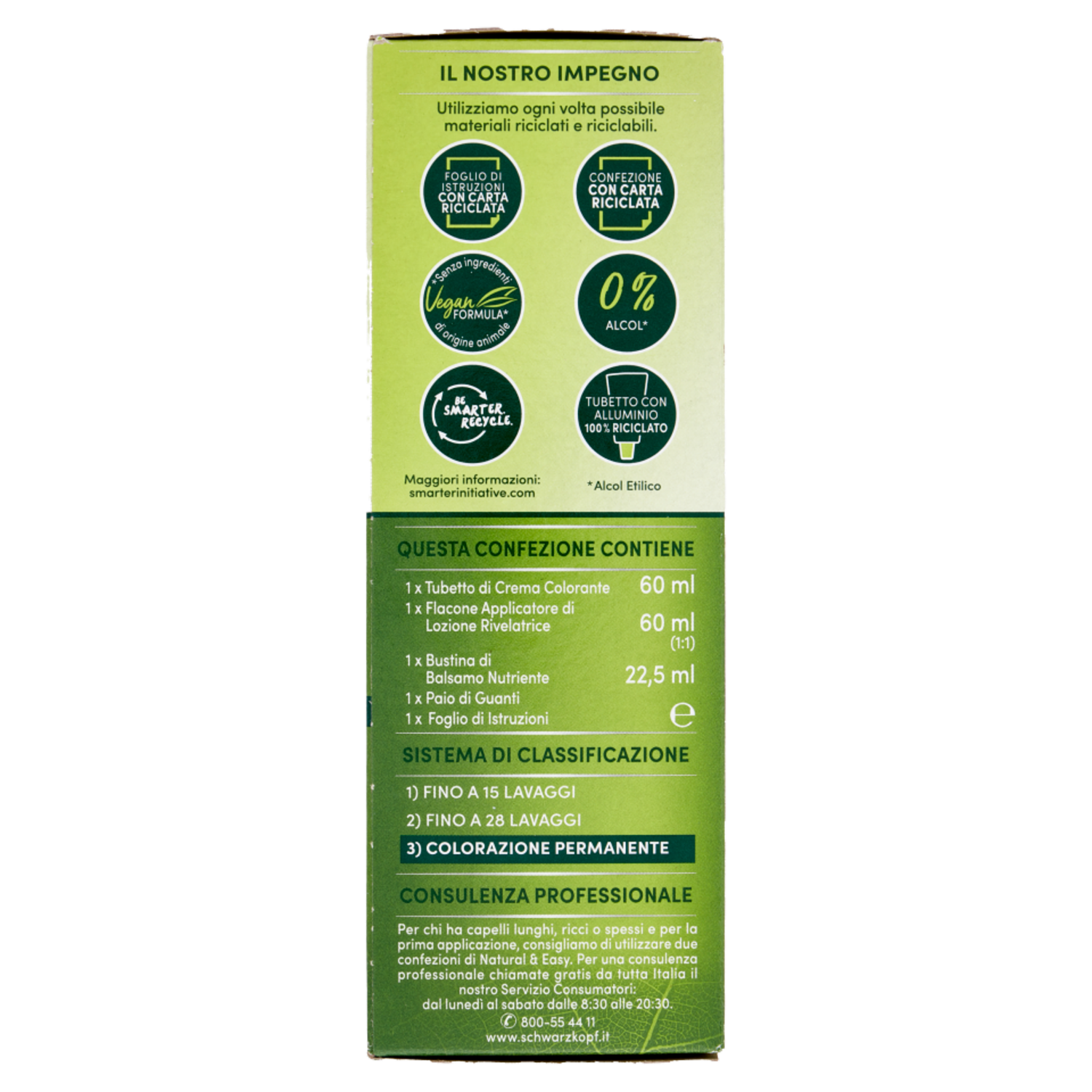 Colorazione permanente nutriente Risultato colore & ingredienti di origine naturale Il marchio Schwarzkopf Natural & Easy è amato per la sua affidabilità e per un risultato colore naturale, ricco di riflessi. Con il 93%* di ingredienti di origine naturale (* inclusa l'acqua), Natural & Easy esalta il colore naturale dei capelli donando luminosità. I restanti ingredienti, che costituiscono il 7% della formula, garantiscono il risultato colore. La nostra crema colorante nutriente con acqua di Lavanda Francese e tre tonalità colore pre-miscelate dona un risultato colore naturale, ricco di riflessi luminosi e il 100% di copertura dei capelli bianchi. Perfetto nutrimento Il Balsamo Nutriente con Olio d'Oliva del Mediterraneo è composto dal 97%* di ingredienti di origine naturale (*inclusa l'acqua) e dona nutrimento e morbidezza ai capelli per un colore luminoso. Le nostre promesse Utilizziamo ogni volta possibile materiali riciclati e riciclabili Ingredients origin 93%* Origine naturale - Olea Europea (Olive) Fruit Oil, Lavender Water, Emollient & Humectant Agent, Aqua, Consistence Regulator L'Olio d'Oliva, di origine naturale, può aiutare a rendere i capelli più morbidi. * inclusa l'acqua Il restante 7%** - Anionic Surfactant, Nonionic Surfactant, Emulsifying Agent, Thickener, Solvent, Surfactant Agent, Cationic Surfactant, Chelating Agent, Antioxidants, Cationic Polymers, Pigments, Perfume, Preservative, PH Agent, Stabilizing Agent, Oxidizing Agent, Alkaline Agent Ingredienti necessari per garantire il risultato colore (pigmenti coloranti) ** non di origine naturale Per l'elenco degli ingredienti dettagliati consultare il fondo di questa confezione.