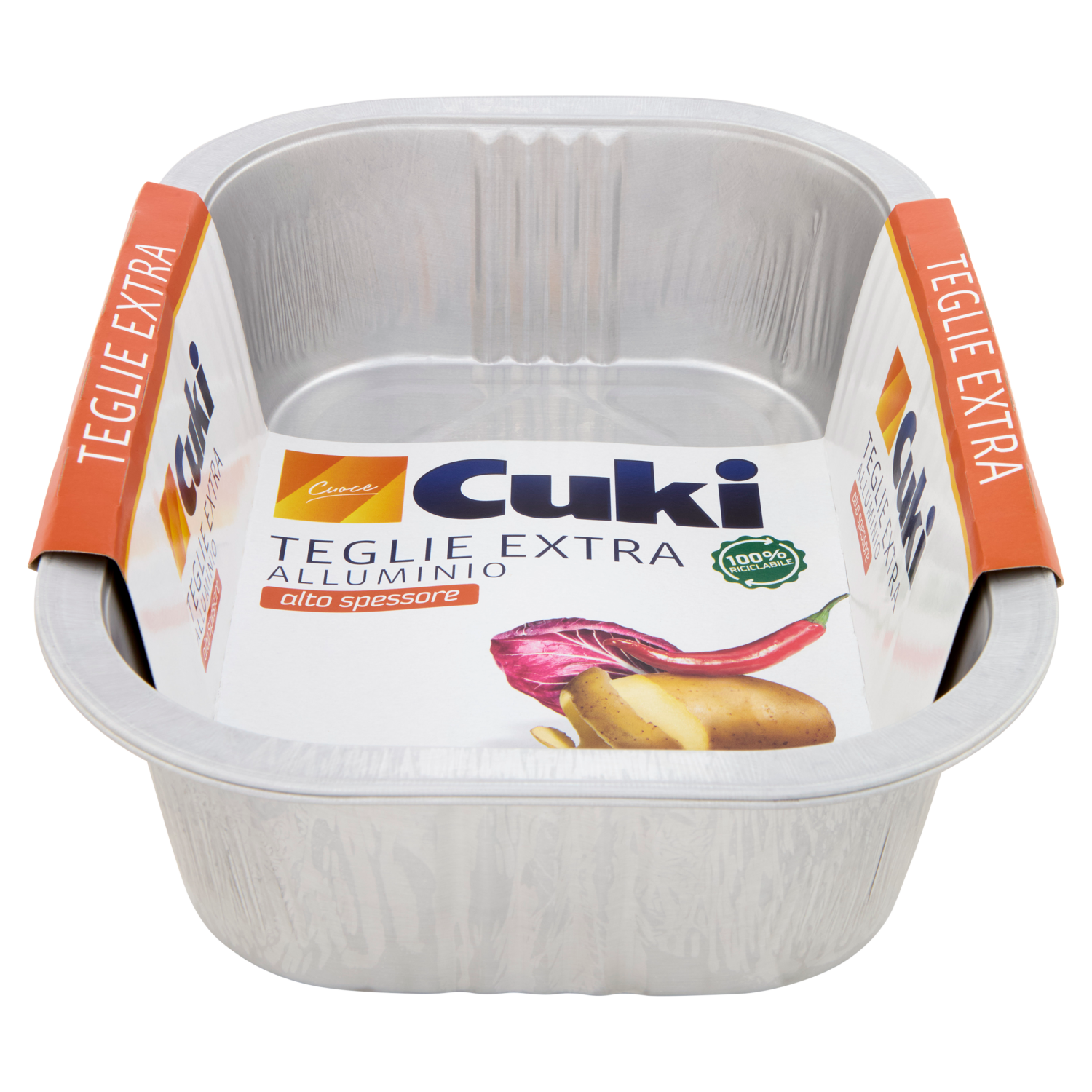 Caratteristiche Cuki Teglie Extra sono realizzate con una particolare tecnologia di produzione innovativa ed in alluminio a spessore maggiorato, per assicurare una eccezionale consistenza e tenuta del contenitore oltre ad una cottura ottimale dei cibi.