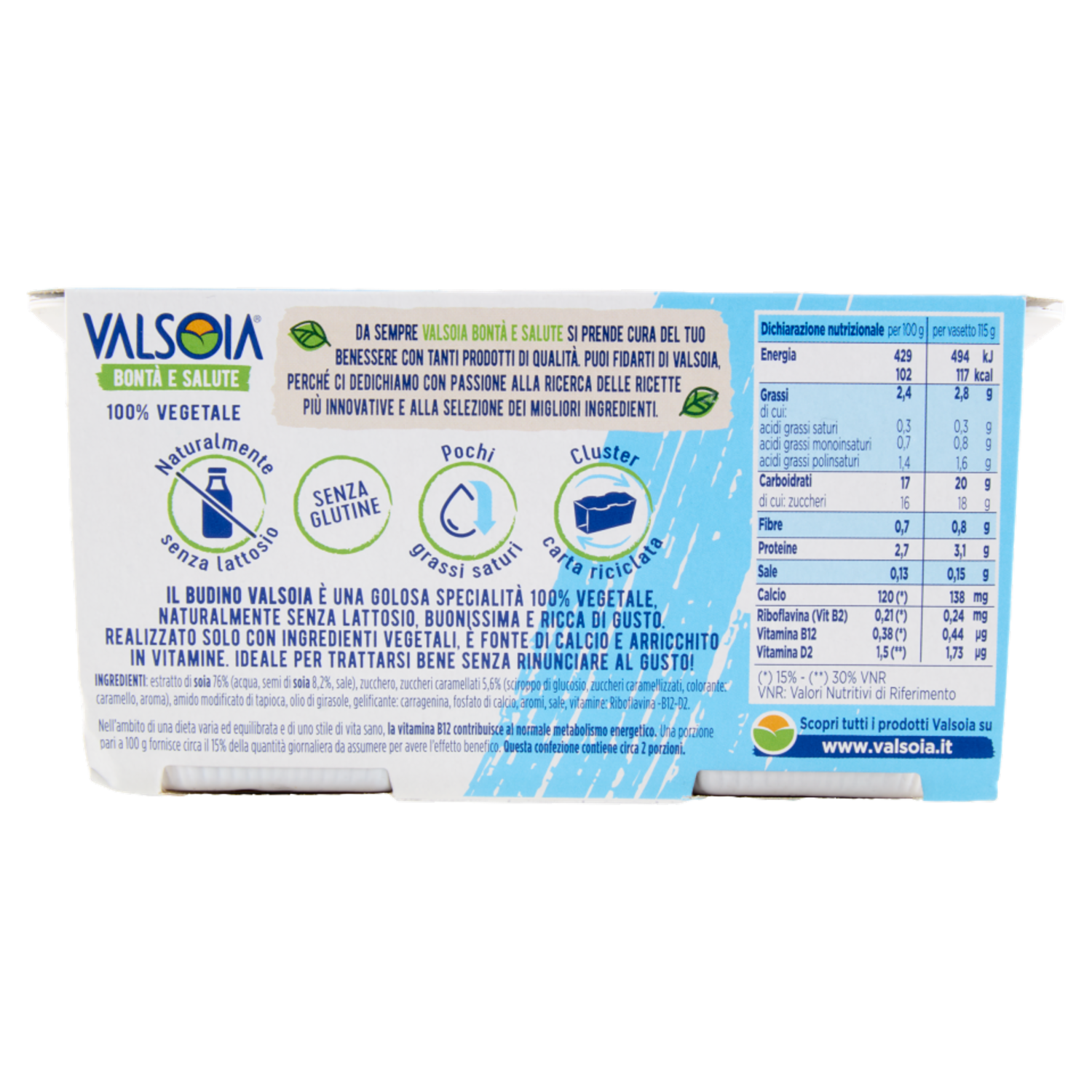Senza glutine A basso contenuto di grassi Il Budino Valsoia è una golosa specialità 100% vegetale, naturalmente senza lattosio, buonissima e ricca di gusto. Realizzato solo con ingredienti vegetali, è fonte di calcio e arricchito in vitamine. Ideale per trattarsi bene senza rinunciare al gusto!