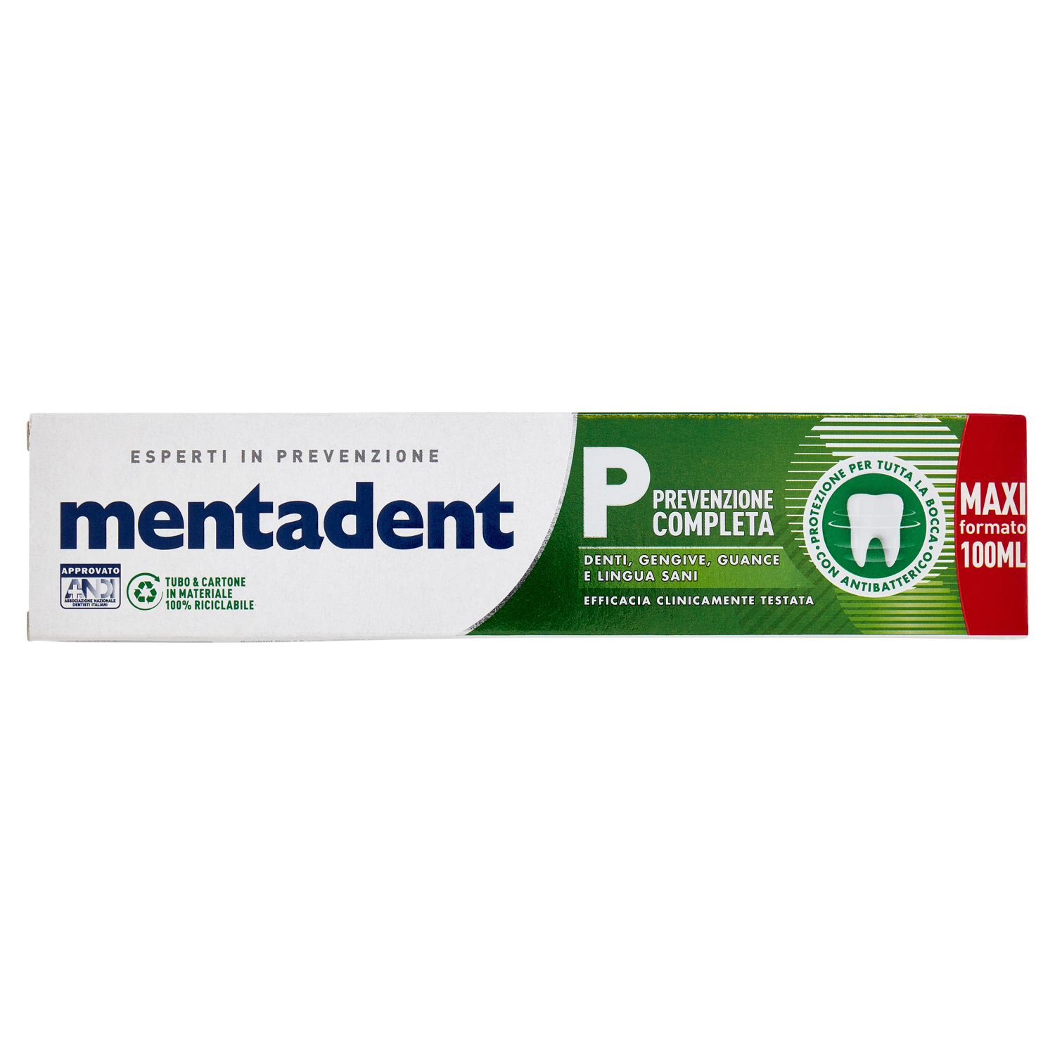 8 Azioni che aiutano a prevenire disturbi orali: 1 Protegge dalla carie 2 Azione anti-placca 3 Combatte il tartaro 4 Ripristina il bianco naturale 5 Rinforza lo smalto 6 Protegge contro le cause della sensibilità 7 Rinforza le gengive 8 Rinfresca l'alito I denti rappresentano solo il 20% della tua bocca - anche gengive, guance e lingua ospitano molte specie batteriche che possono causare problemi orali. Mentadent P Prevenzione Completa protegge la salute di tutta la bocca, combattendo i batteri* su denti, gengive, guance e lingua. *Studio Clinico in vivo sulla riduzione dei batteri su denti, gengive, guance e lingua, dopo 14 e 28 giorni di utilizzo del prodotto. Da oggi con più zinc mineral: - Ingrediente attivo antibatterico di origine naturale - Assorbito gradualmente dalle gengive e rilasciato in tutta la bocca - Offre 18 ore di efficacia anti-placca - Efficacia clinicamente testata Approvato ANDI - Associazione Nazionale Dentisti Italiani L'A.N.D.I riconosce che un dentifricio al fluoro aiuta a prevenire la formazione della placca proteggendo la salute di denti e gengive. Mentadent P Prevenzione Completa soddisfa questi requisiti ed è quindi di significativa utilità, unito ad una sostituzione regolare dello spazzolino e ad un suo corretto utilizzo. FDI World Dental Federation FDI riconosce che lavarsi i denti almeno due volte al giorno con un dentifricio al fluoro, come Mentadent P Prevenzione Completa, è di significativa utilità per una corretta igiene orale.