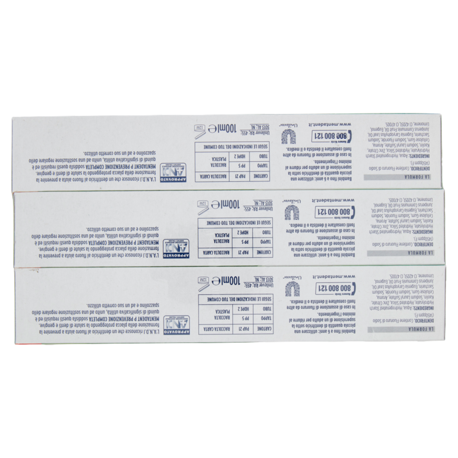 8 Azioni che aiutano a prevenire disturbi orali: 1 Protegge dalla carie 2 Azione anti-placca 3 Combatte il tartaro 4 Ripristina il bianco naturale4 5 Rinforza lo smalto 6 Protegge contro le cause della sensibilità 7 Rinforza le gengive 8 Rinfresca l'alito I denti rappresentano solo il 20% della tua bocca - anche gengive, guance e lingua ospitano molte specie batteriche che possono causare problemi orali. Mentadent P Prevenzione Completa protegge la salute di tutta la bocca, combattendo i batteri* su denti, gengive, guance e lingua. *Studio Clinico in vivo sulla riduzione dei batteri su denti, gengive, guance e lingua, dopo 14 e 28 giorni di utilizzo del prodotto. Da oggi con più Zinc Mineral: - Ingrediente attivo antibatterico di origine naturale - Assorbito gradualmente dalle gengive e rilasciato in tutta la bocca - Offre 18 ore di efficacia anti-placca - Efficacia clinicamente testata Approvato ANDI - Associazione Nazionale Dentisti Italiani L'A.N.D.I riconosce che un dentifricio al fluoro aiuta a prevenire la formazione della placca proteggendo la salute di denti e gengive. Mentadent P Prevenzione Completa soddisfa questi requisiti ed è quindi di significativa utilità, unito ad una sostituzione regolare dello spazzolino e ad un suo corretto utilizzo.