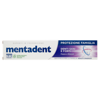Mentadent protezione famiglia denti sani e forti Il dentifricio adatto ad adulti e ragazzi. La sua formula a base fluoro e minerali è sviluppata per essere adatta dai 7 anni in su, aiuta a combattere la carie, rinforzare i tuoi denti e proteggerli contro il tartaro. Scopri la linea completa di dentifrici Mentadent Protezione Famiglia, pensati per soddisfare le diverse esigenze. Approvato ANDI - Associazione Nazionale Dentisti Italiani L'A.N.D.I. riconosce che un dentifricio al fluoro aiuta a prevenire la formazione della placca proteggendo la salute di denti e gengive. Mentadent protezione famiglia denti sani e forti soddisfa questi requisiti ed è quindi di significativa utilità, unito ad una sostituzione regolare dello spazzolino e ad un suo corretto utilizzo. FDI World Dental Federation FDI riconosce che lavarsi i denti almeno due volte al giorno con un dentifricio al fluoro, come Mentadent Protezione Famiglia Denti Sani E Forti, è di significativa utilità per una corretta igiene orale