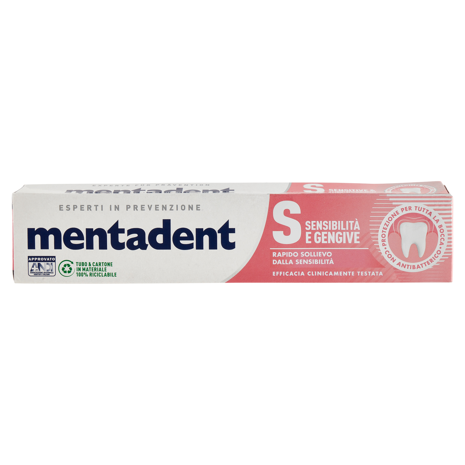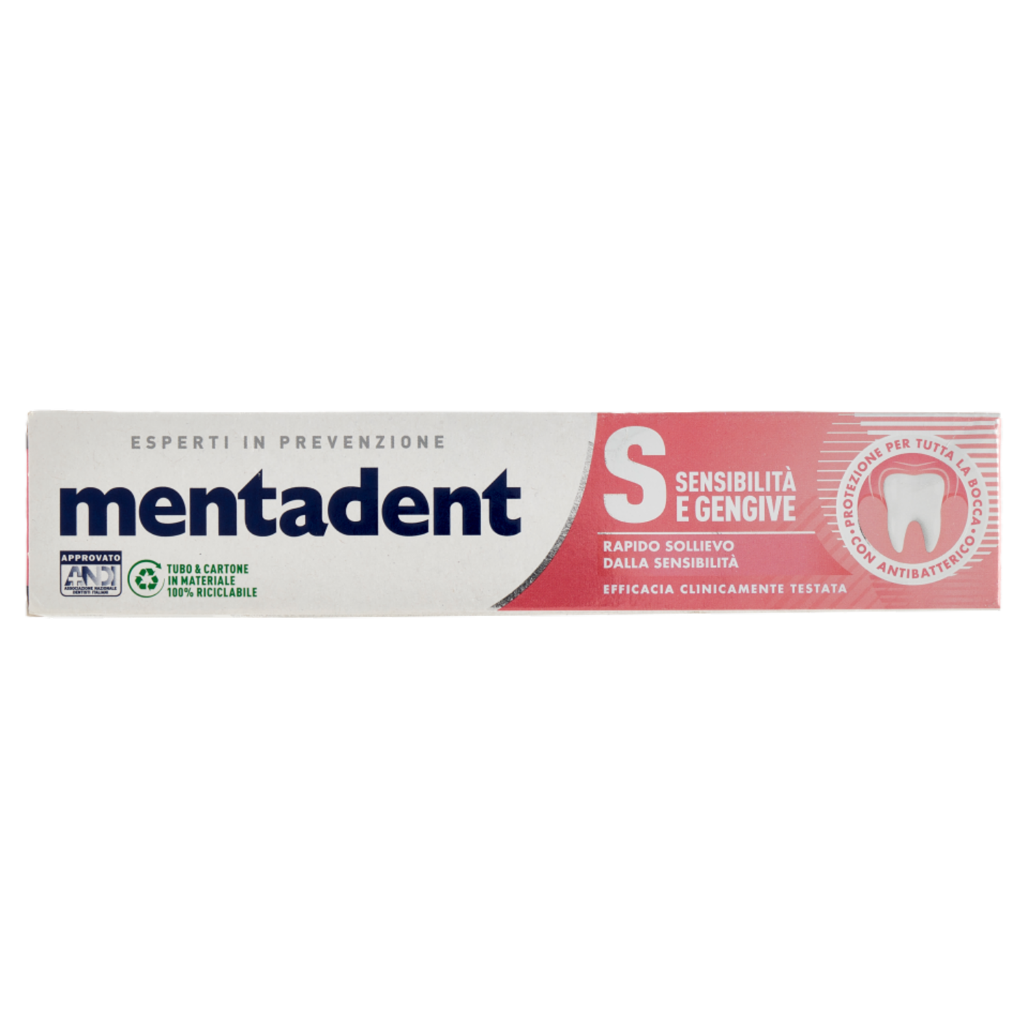 Mentadent S Sensibilità e Gengive combatte i batteri* in tutta la bocca, rinforzando le gengive e riducendo una delle cause dell'infiammazione gengivale occasionale, aiutando a proteggere dalla sensibilità. *Studio Clinico in vivo sulla riduzione dei batteri su denti, gengive, guance e lingua, dopo 14 e 28 giorni di utilizzo del prodotto. Da oggi con più zinc mineral: - Ingrediente attivo antibatterico di origine naturale - Assorbito gradualmente dalle gengive e rilasciato in tutta la bocca - Offre 18 ore di efficacia anti-placca - Efficacia clinicamente testata - Denti, gengive, guance e lingua sani Inoltre, contiene potassio che offre rapido sollievo dal fastidio dei denti sensibili. Approvato ANDI - Associazione Nazionale Dentisti Italiani L'A.N.D.I riconosce che un dentifricio al fluoro aiuta a prevenire la formazione della placca proteggendo la salute di denti e gengive. Mentadent S Sensibilità e Gengive soddisfa questi requisiti ed è quindi di significativa utilità, unito ad una sostituzione regolare dello spazzolino e ad un suo corretto utilizzo.