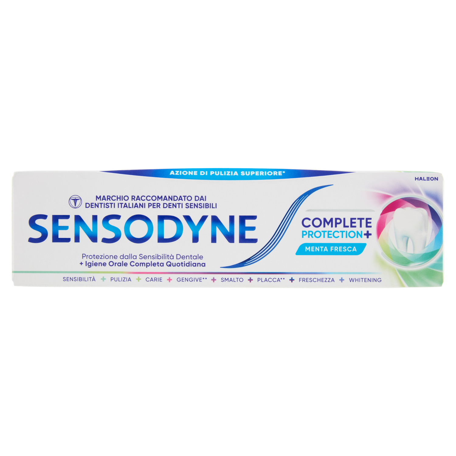 Igiene orale completa quotidiana per i denti sensibili Prendersi cura dei denti sensibili non dovrebbe comportare la rinuncia ad altri benefici importanti Aiutaci a proteggere il pianeta riciclando le nostre confezioni e utilizzando l'acqua in modo responsabile. + Alito fresco + Pulizia profonda + Protezione dalle carie + Gengive sane** + Smalto forte + Rimozione della placca** + Sollievo dalla sensibilità dentale + Whitening **usato due volte al giorno Il nuovo Sensodyne Complete Protection + è un dentifricio quotidiano per l'igiene orale che fornisce molteplici benefici e una protezione clinicamente provata dai fastidi della sensibilità dentale. Menta fresca per una sensazione di freschezza duratura e rivitalizzante. Doppia menta rinfrescante con un mix di erbe aromatiche. La nostra unica formulazione con Advanced Cleaning System, contiene particelle sferiche minerali pulenti per un'azione di pulizia superiore* *rispetto a Sensodyne F-Previon Cartone riciclato Cartone riciclabile Tubo e tappo riciclabili Risparmia acqua - Chiudi il rubinetto mentre lavi i denti