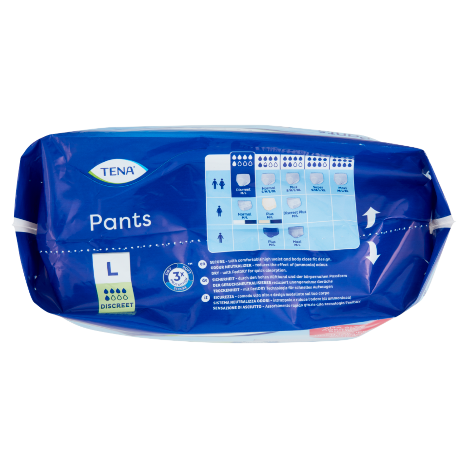 Mutandina assorbente monouso a vita alta, modellata sul tuo corpo per una comoda e aderente vestibilità. Indicata per perdite urinarie moderate Sicurezza - comoda vita alta e design modellato sul tuo corpo Sistema Neutralizza Odori - intrappola e riduce l'odore (di ammoniaca) Sensazione di Asciutto - Assorbimento rapido grazie alla tecnologia FeelDRY