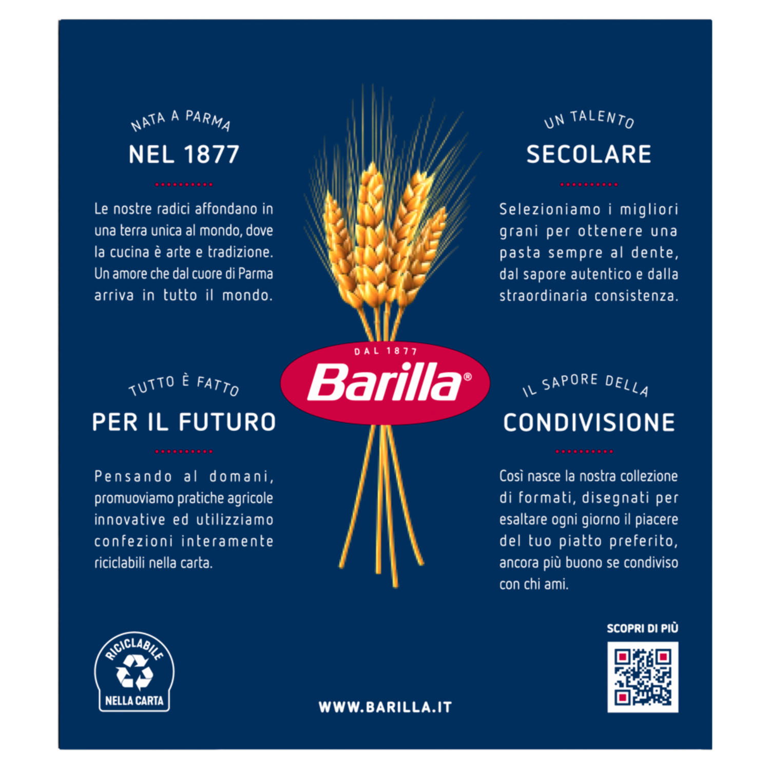 Barilla Dal 1877 Grani selezionati 100% italiani Siamo fieri di essere al fianco delle organizzazioni di 8.000 agricoltori d'Italia che coltivano grano duro di qualità per la nostra pasta. A Parma dal 1877 A Parma il buon cibo è tradizione ed eccellenza gastronomica, gioia di vivere e cultura: qui è dove siamo nati. Il domani è oggi La pasta Barilla la conosci da sempre: perciò abbiamo tolto la finestra trasparente, risparmiando 126.000 kg di plastica all'anno.* Un gesto d'amore Ogni giorno ci impegniamo a darti la nostra pasta migliore, sempre al dente, per far felice chi ami. *rimozione finestra dai Classici Barilla; valore calcolato sulle confezioni in cartoncino vendute nel 2020. Scopri di più su barilla.com/box. Per noi la qualità è una tradizione di famiglia dal 1877. www.barilla.it