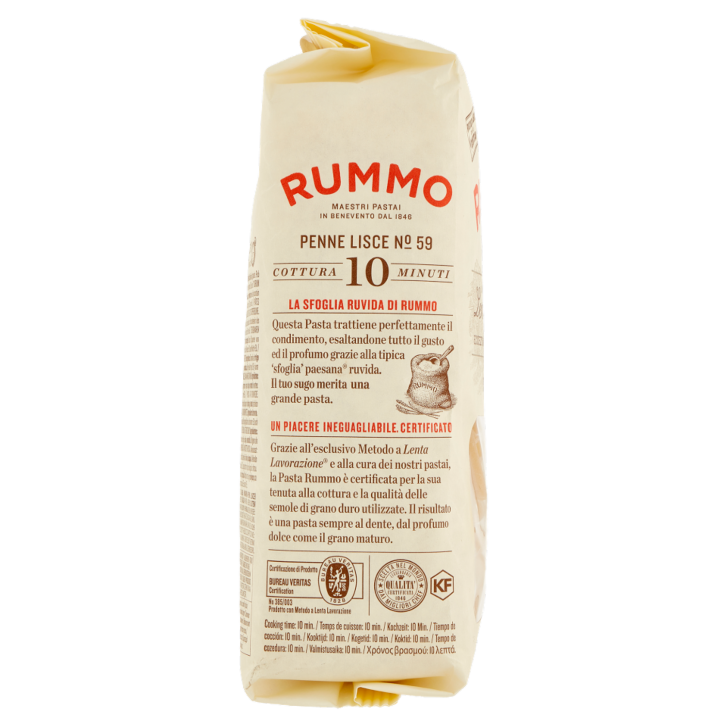 La filosofia del gusto Crediamo che la Pasta sia Cultura del nostro Paese. Per questo rispettiamo il piacere tutto italiano per la buona tavola, le grandi tradizioni regionali e le piccole eccelenze del territorio. Con la Lenta Lavorazione, un esclusivo metodo dal quale nasce una pasta ineguagliabile, vogliamo raccontare un viaggio alla riscoperta dei tempi dell' artigiano, fatti di attenzione e cura dei particolari. La sfoglia ruvida di Rummo Questa Pasta trattiene perfettamente il condimento, esaltandone tutto il gusto ed il profumo grazie alla tipica 'sfoglia' paesana ruvida. Il tuo sugo merita una grande pasta. Un piacere ineguagliabile. Certificato Grazie all'esclusivo Metodo a Lenta Lavorazione e alla cura dei nostri pastai, la Pasta Rummo è certificata per la sua tenuta alla cottura e la qualità delle semole di grano duro utilizzate. Il risultato è una pasta sempre al dente, dal profumo dolce come il grano maturo. Qualità leggendaria certificata - 1846 Scelta nel mondo dai migliori chef