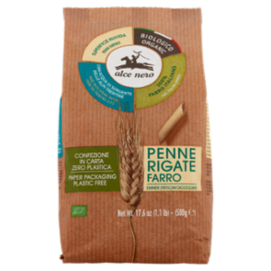Etichetta narrante La pasta di farro Alce Nero è prevalentemente realizzata con farro medio o farro Dicocco, così denominato perché contiene di norma 2 cariossidi per spighetta. La semina avviene generalmente in autunno, ma nelle zone di montagna più fredde può essere ritardata fino a primavera inoltrata. La raccolta del farro è più tardiva rispetto agli altri cereali e viene effettuata in estate inoltrata, prestando particolare attenzione nella fase di trebbiatura per evitare di spezzare la granella. La granella di farro viene prima decorticata e poi trasportata verso il Molino De Vita, socio di Alce Nero. In una zona verde, lontana dalle grandi vie di comunicazione, il mulino trasforma il farro in semola, utilizzando tecnologie avanzate e cilindri di macinazione a basso regime che preservano il più possibile le qualità del grano. Infine la semola viaggia verso il Trentino dove l'acqua di sorgente delle Alpi incontra la maestria dei pastai Felicetti, anch'essi soci di Alce Nero, dando vita ad una pasta 100% italiana, biologica e garantita dai Soci del Gruppo Alce Nero.