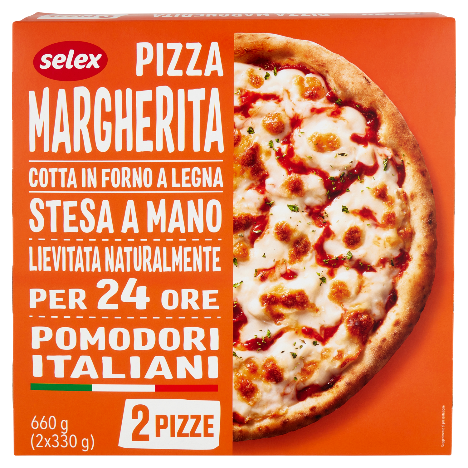 Modalità di preparazione Preriscaldare il forno a 220°C, rimuovere tutti gli imballi, lasciare che la pizza si scongeli a temperatura ambiente ed infine cuocerla sulla griglia, a metà altezza, del forno per 7/9 minuti o almeno fino a quando la mozzarella è ben fusa. Il tempo e la temperatura di cottura possono variare a seconda del forno utilizzato.