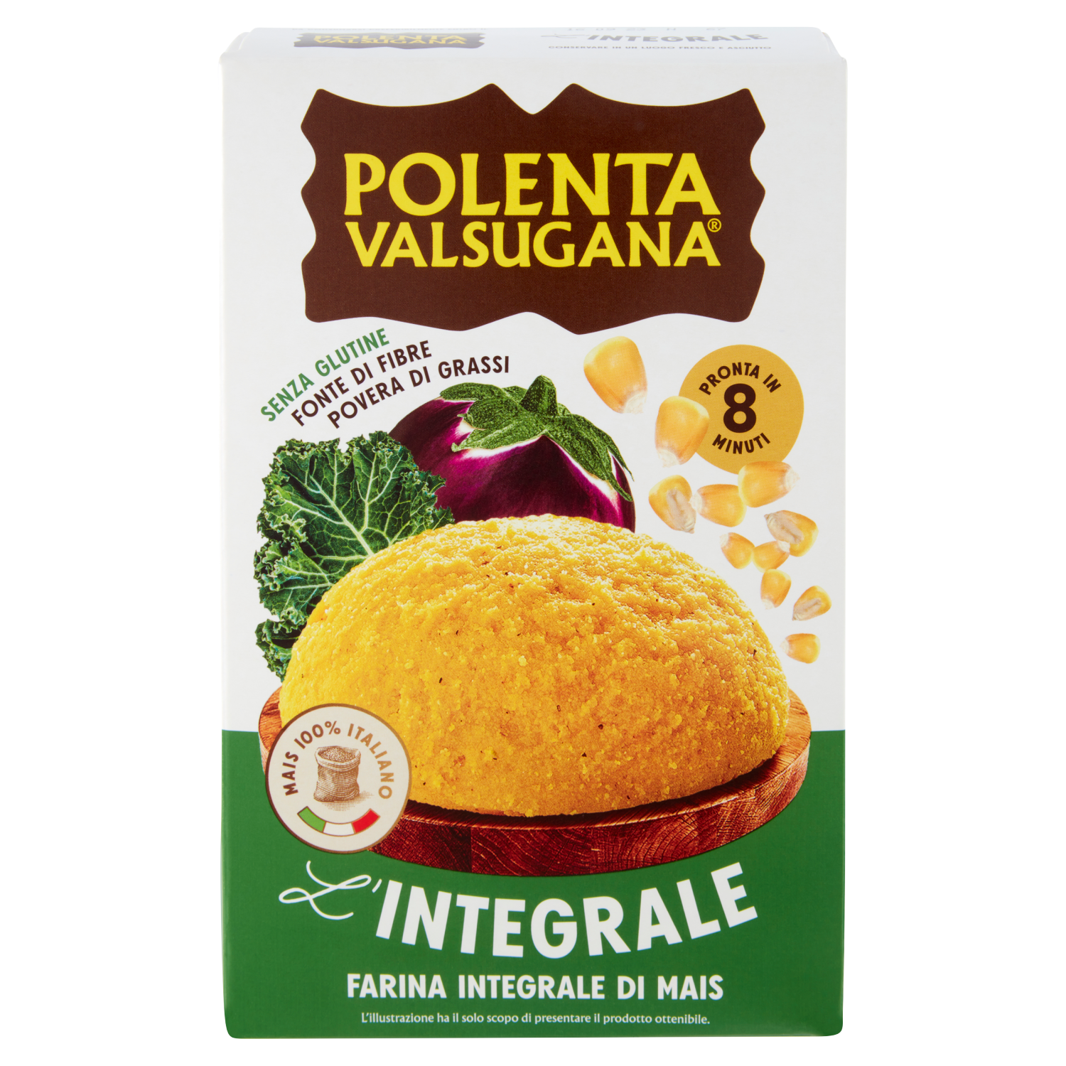 La bontà unica di Polenta Valsugana è il risultato di un lungo lavoro di ricerca della qualità delle materie prime. Polenta Valsugana Integrale è fatta solo con farina di mais integrale. È realizzata dalla macinazione di chicchi di mais interi, da cui si ottiene una farina ricca di crusca che contiene fibre, preziose alleate per un'alimentazione equilibrata. Senza glutine Il mais è naturalmente privo di glutine. Fonte di fibre Le fibre si trovano nella parte integrale del mais e sono preziose alleate per un'alimentazione equilibrata. Povera di grassi È povera in grassi e questo la rende perfetta per la preparazione di piatti gustosi e leggeri.
