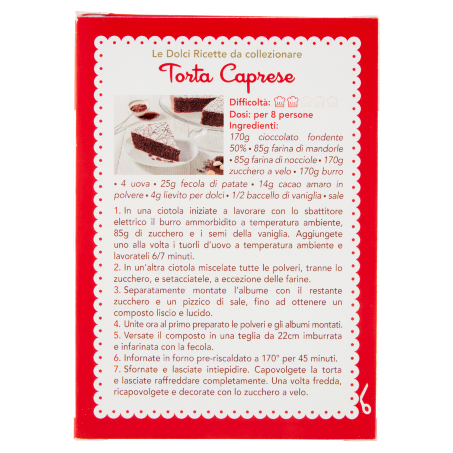 Le Dolci Ricette da collezionare Torta Caprese Difficoltà: 2 su 5 Dosi: per 8 persone Ingredienti: 170g cioccolato fondente 50% - 85g farina di mandorle - 85g farina di nocciole - 170g zucchero a velo - 170g burro - 4 uova - 25g fecola di patate - 14g cacao amaro in polvere - 4g lievito per dolci - 1/2 baccello di vaniglia - sale 1. In una ciotola iniziate a lavorare con lo sbattitore elettrico il burro ammorbidito a temperatura ambiente, 85g di zucchero e i semi della vaniglia. Aggiungete uno alla volta i tuorli d'uovo a temperatura ambiente e lavorateli 6/7 minuti. 2. In un'altra ciotola miscelate tutte le polveri, tranne lo zucchero, e setacciatele, a eccezione delle farine. 3. Separatamente montate l'albume con il restante zucchero e un pizzico di sale, fino ad ottenere un composto liscio e lucido. 4. Unite ora al primo preparato le polveri e gli albumi montati. 5. Versate il composto in una teglia da 22cm imburrata e infarinata con la fecola. 6. Infornate in forno pre-riscaldato a 170° per 45 minuti. 7. Sfornate e lasciate intiepidire. Capovolgete la torta e lasciate raffreddare completamente. Una volta fredda, ricapovolgete e decorate con lo zucchero a velo.