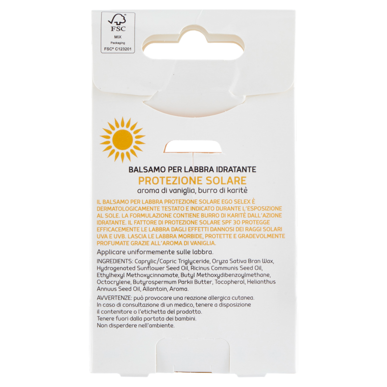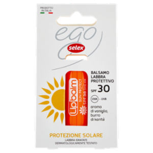 Il balsamo per labbra protezione solare Ego Selex è dermatologicamente testato e indicato durante l'esposizione al sole. La formulazione contiene burro di karitè dall'azione idratante. Il fattore di protezione solare SPF 30 protegge efficacemente le labbra dagli effetti dannosi dei raggi solari UVA e UVB. Lascia le labbra morbide, protette e gradevolmente profumate grazie all'aroma di vaniglia.