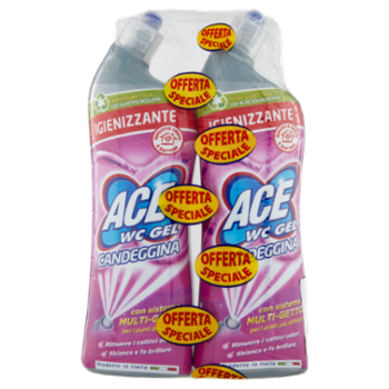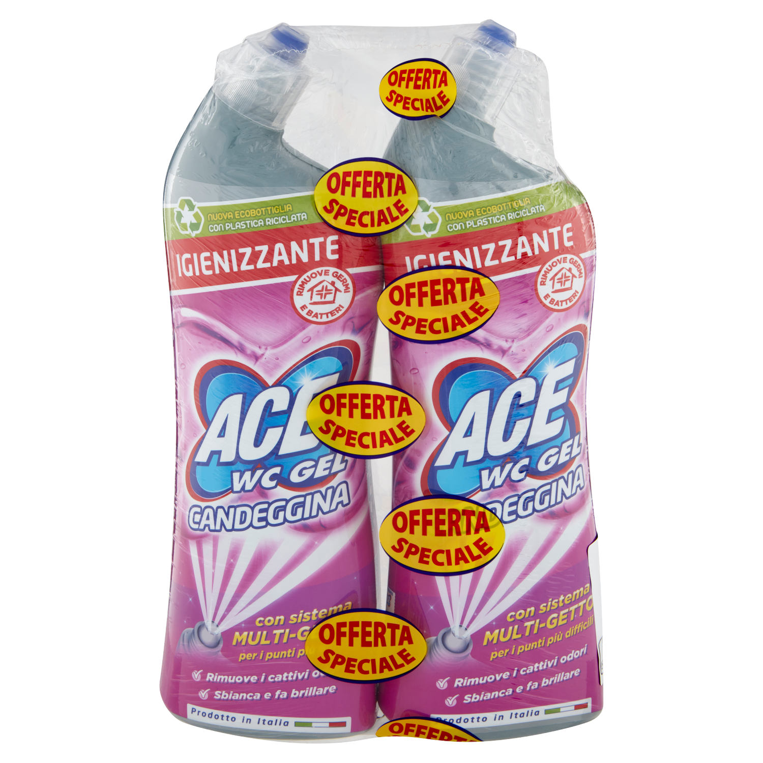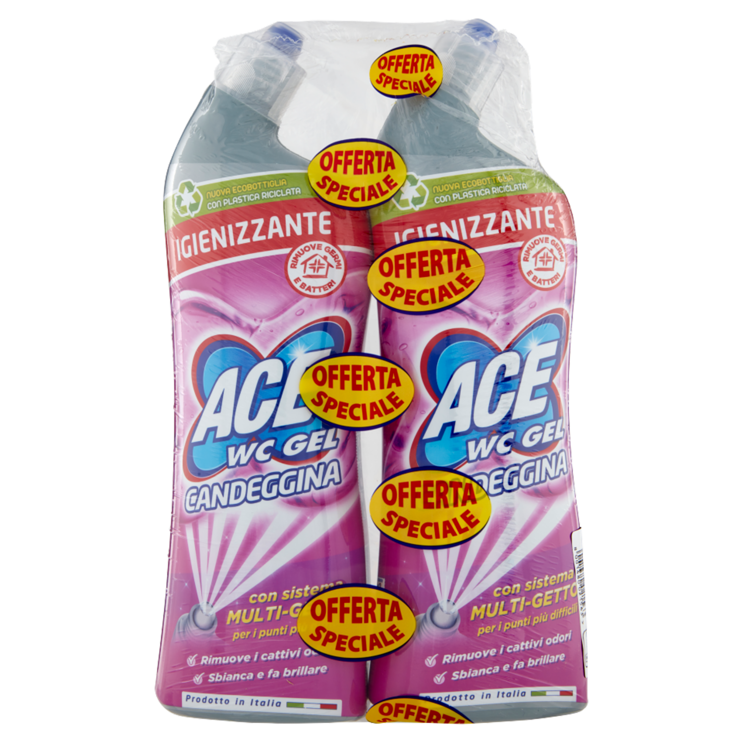 Grazie all'innovativo Sistema Multi-Getto, Ace Wc Gel igienizza il WC anche nei punti più difficili da raggiungere. In una sola applicazione, i sei getti arrivano facilmente anche sotto il bordo e garantiscono una copertura completa ed uniforme del WC. Grazie alla sua formula igienizzante, rimuove germi e batteri. Il prodotto non è un disinfettante. Ace rispetta l'ambiente: - Ecobottiglie con plastica riciclata - 100% Riciclabili - Formula senza micro plastiche