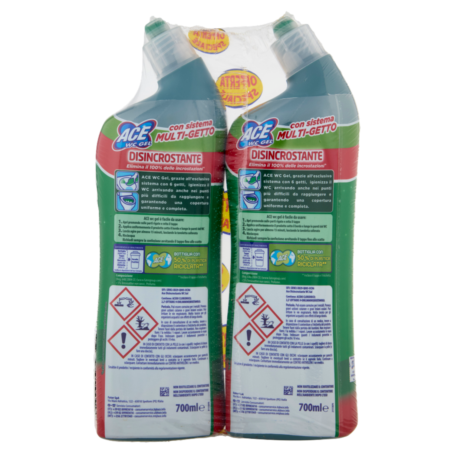 Elimina il 100% delle incrostazioni* *le più comuni incrostazioni, con l'uso regolare del prodotto Da oggi Ace WC Gel elimina il 99.99% di germi e batteri, disinfettando il WC. Grazie all'innovativo sistema con 6 getti, Ace WC Gel arriva anche nei punti più difficili da raggiungere garantendo una copertura uniforme e completa del WC. Ace rispetta l'ambiente: - Ecobottiglie con plastica riciclata - 100% Riciclabili - Formula senza micro plastiche