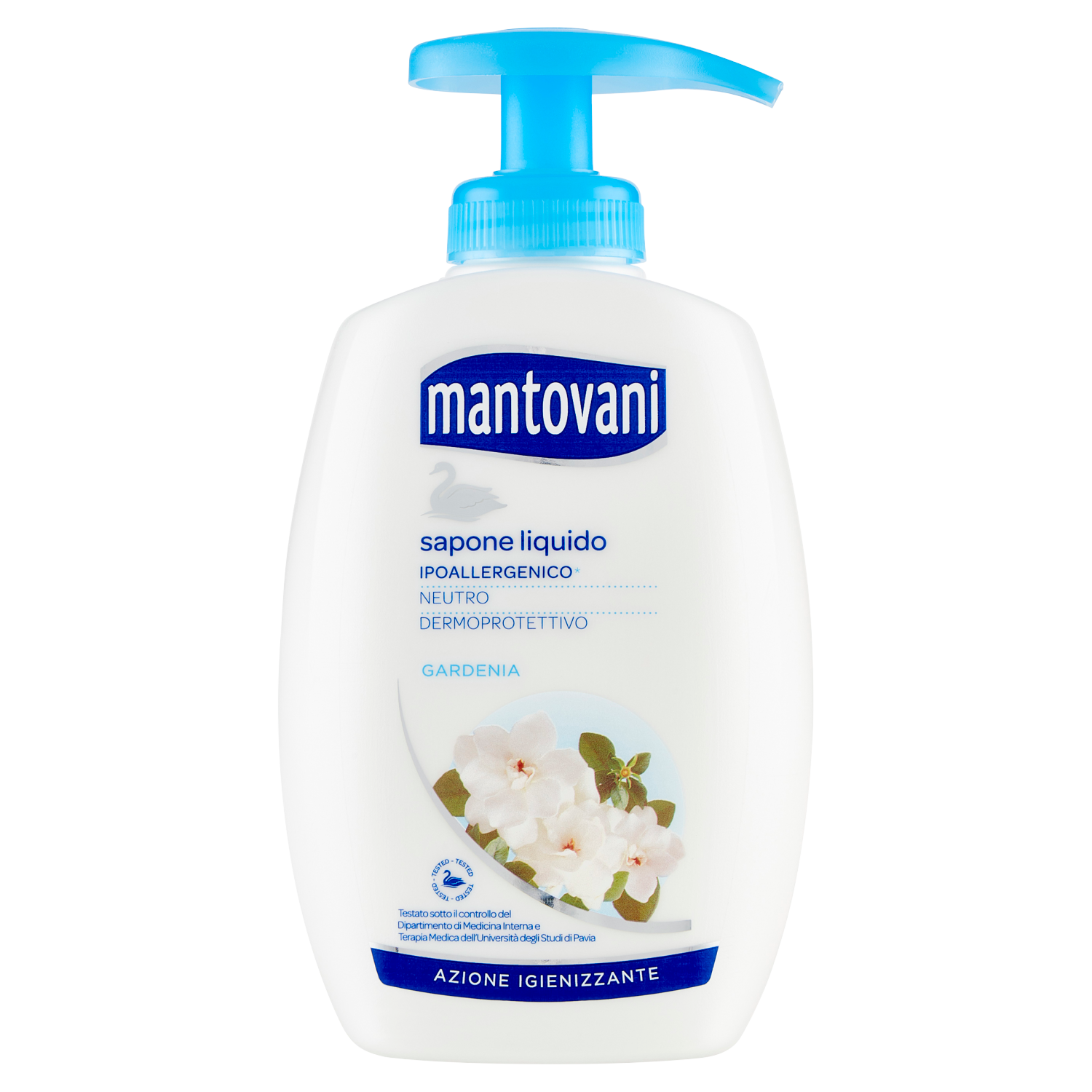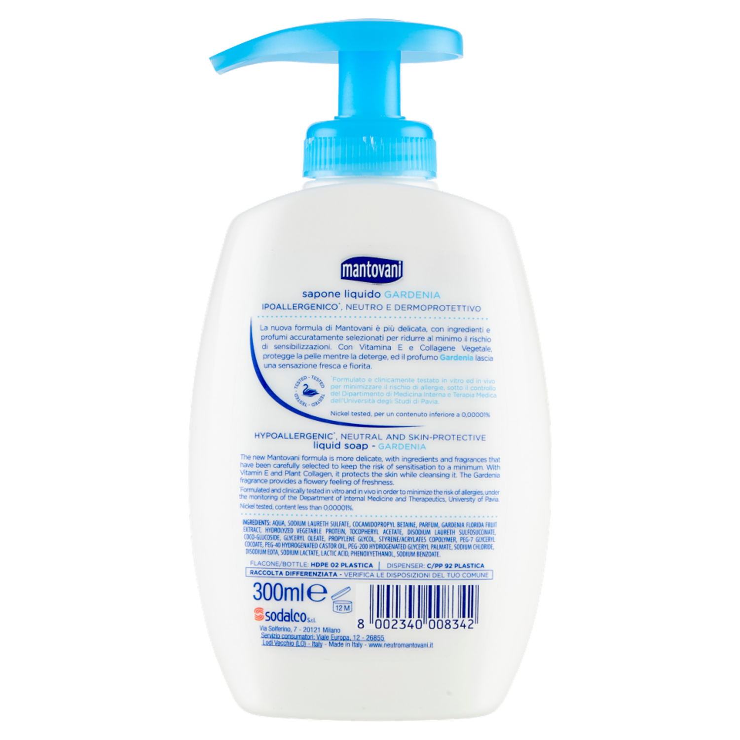 sapone liquido Gardenia Ipoallergenico*, neutro e dermoprotettivo *Formulato e clinicamente testato in vitro ed in vivo per minimizzare il rischio di allergie, sotto il controllo del Dipartimento di Medicina Interna e Terapia Medica dell'Università degli Studi di Pavia. La nuova formula di Mantovani è più delicata, con ingredienti e profumi accuratamente selezionati per ridurre al minimo il rischio di sensibilizzazioni. Con Vitamina E e Collagene Vegetale, protegge la pelle mentre la deterge, ed il profumo Gardenia lascia una sensazione fresca e fiorita. Nickel tested, per un contenuto inferiore a 0,00001%