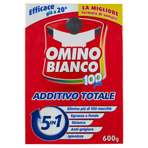 Rinforza l'efficacia del detersivo. Aggiungi una dose ad ogni lavaggio. In lavatrice Aggiungere al detersivo abituale direttamente nella vaschetta o nella pallina diffusore. Per il bucato quotidiano e macchie normali aggiungere una tazzina da caffè Per il bucato grosso e macchie difficili o secche aggiungere una tazzina e mezza da caffè In caso di macchie ostinate, si consiglia di mettere in ammollo o di pre-trattare A mano Aggiungere al detersivo abituale. una tazzina da caffè in 3 litri d'acqua tiepida (40°) In caso di sporco normale lasciare in ammollo 20-30 min. In caso di sporco difficile Pre-trattamento. Sciogliere 6g (circa un cucchiaino da caffè) di Omino Bianco Additivo Totale in una tazzina di acqua tiepida (40° C). Coprire la macchia con la soluzione ottenuta e lasciare agire per massimo 5 minuti. Risciacquare abbondantemente e procedere con il lavaggio abituale. Ammollo. Sciogliere 50g (circa una tazzina da caffè) di Omino Bianco Additivo Totale in 5 litri di acqua tiepida (40° C). Lasciare il capo in ammollo per massimo 1 ora in caso di capi colorati o da 3 a 6 ore in caso di capi bianchi. Risciacquare e procedere con il lavaggio abituale. Consigli utili - Seguire sempre le istruzioni di lavaggio riportate sulle etichette dei capi. - In caso di dubbi sulla resistenza del capo e/o dei colori, immergere un angolo non visibile del capo nella soluzione di Omino Bianco Additivo Totale. - Non usare la polvere direttamente sui tessuti. Non usare su lana, seta e pellame. - Non lasciare in ammollo capi con parti metalliche. - Per macchie come vernice secca, ruggine, penna biro e pennarelli, potrebbe essere impossibile la rimozione.