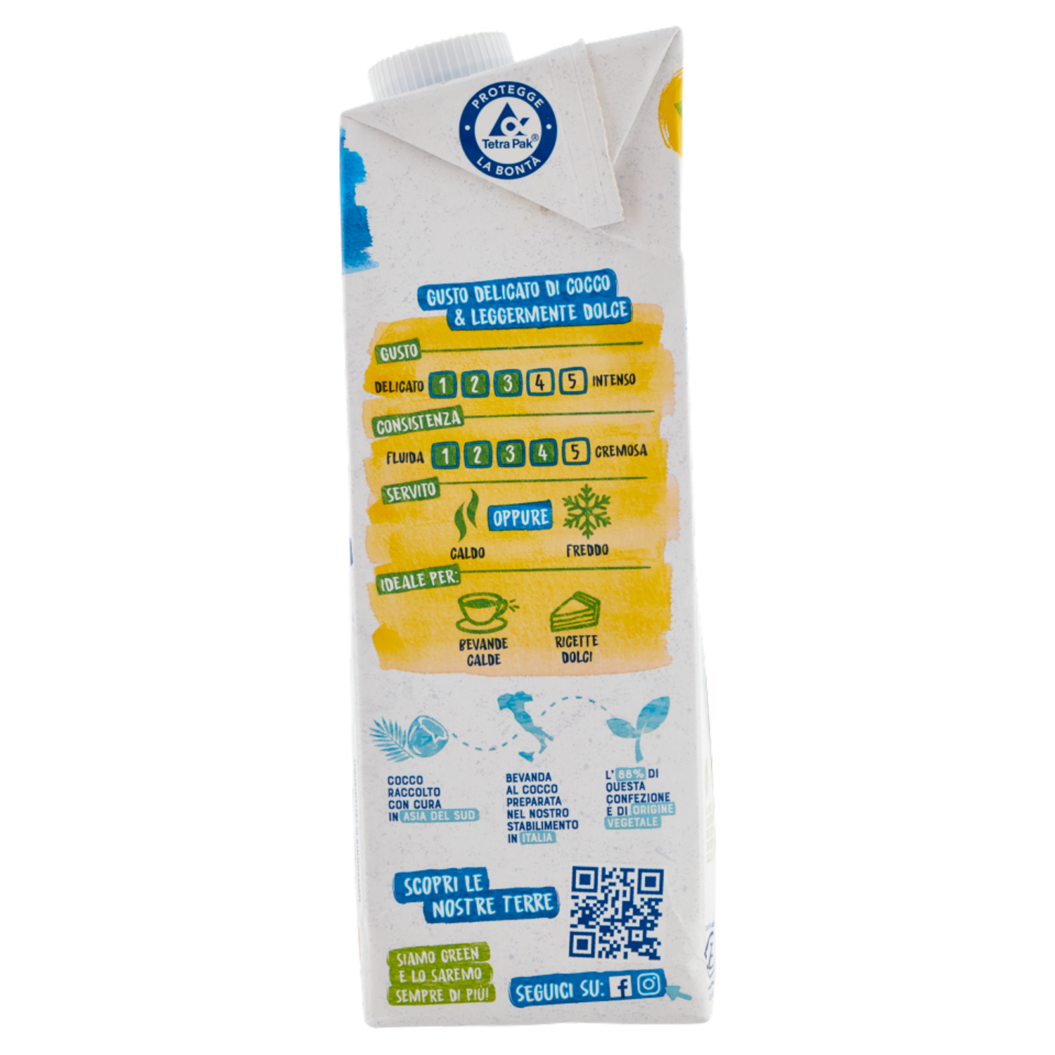 A basso contenuto di sale La nostra confezione contribuisce ad una riduzione delle emissioni di CO² sulla nostra gamma La carta della nostra confezione proviene da foreste gestite in maniera responsabile e altre fonti controllate e vanta la certificazione FSC Cocco raccolto con cura in Asia del Sud Bevanda al cocco preparata nel nostro stabilimento in Italia L'88% di questa confezione è di origine vegetale