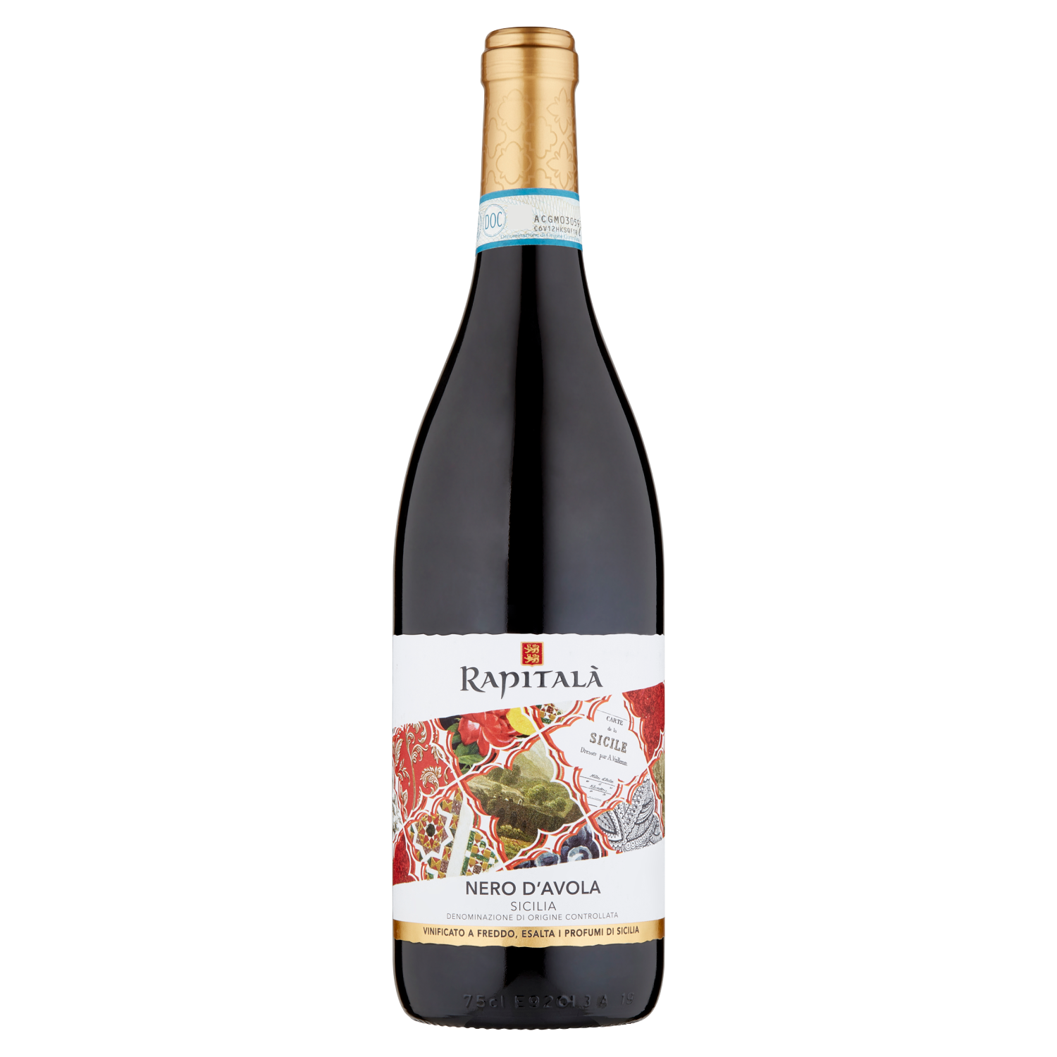 Nero d'Avola Sicilia DOC, vino rosso italiano. Vitigno: I vini Rapitalà sono realizzati grazie a diverse tecniche volte a lavorare le uve e i mosti a basse temperature per esaltare le note aromatiche della natura siciliana. Caratteristiche: Vino rosso intenso ed armonico al gusto, presenta sentori di frutta matura. Sicilia Denominazione di Origine Controllata