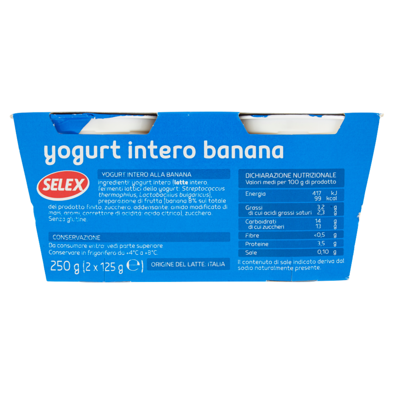 Preparazione di frutta (banana 8% sul totale del prodotto finito, zucchero, addensante: amido modificato di mais, aromi, correttore di acidità: acido citrico)