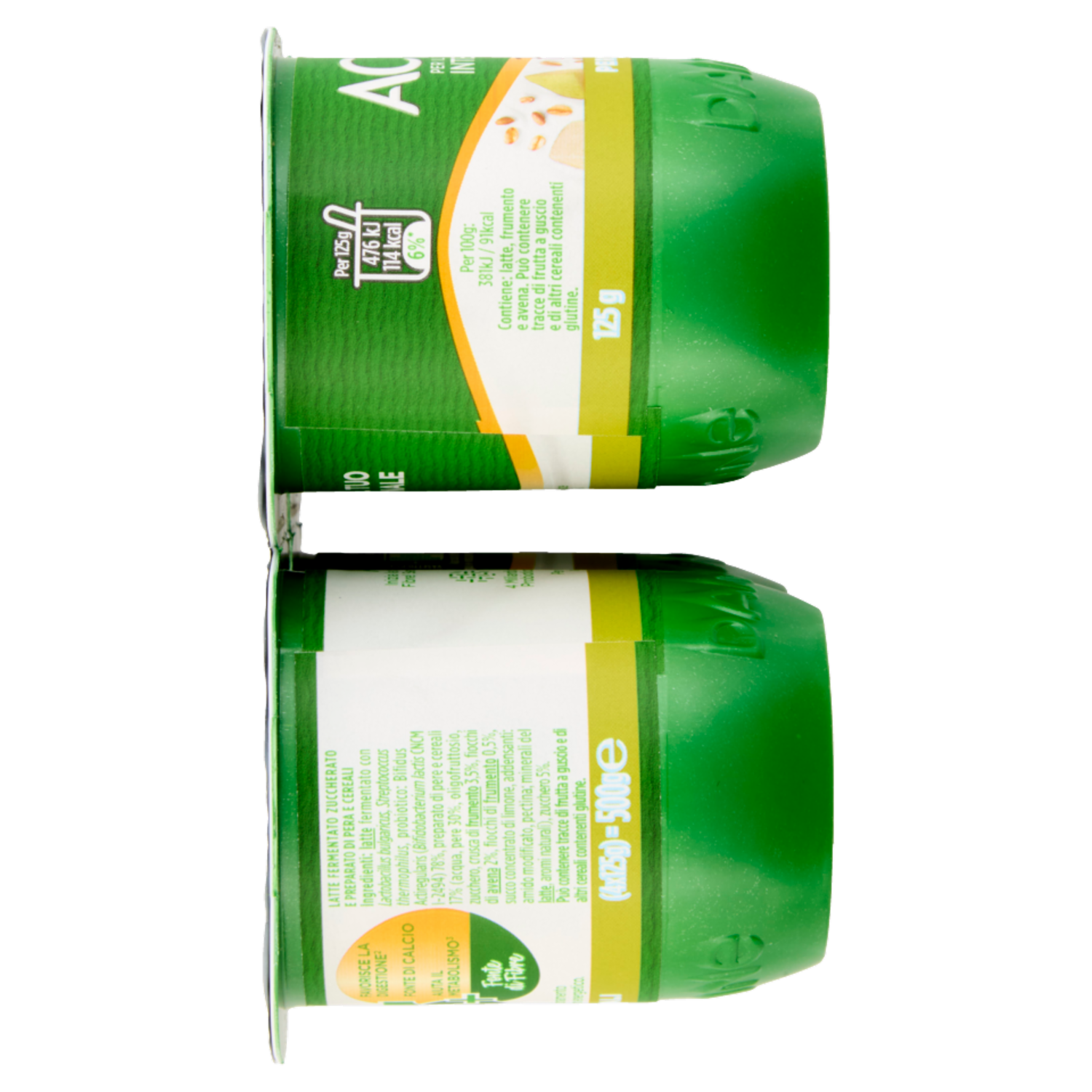 Preparato di pere e cereali 17% (acqua, pere 30%, oligofruttosio, zucchero, crusca di frumento 3,5%, amido di tapioca, fiocchi di avena 2%, fiocchi di frumento 0,5%, succo di limone concentrato, addensante (pectina), minerali del latte, aromi naturali)