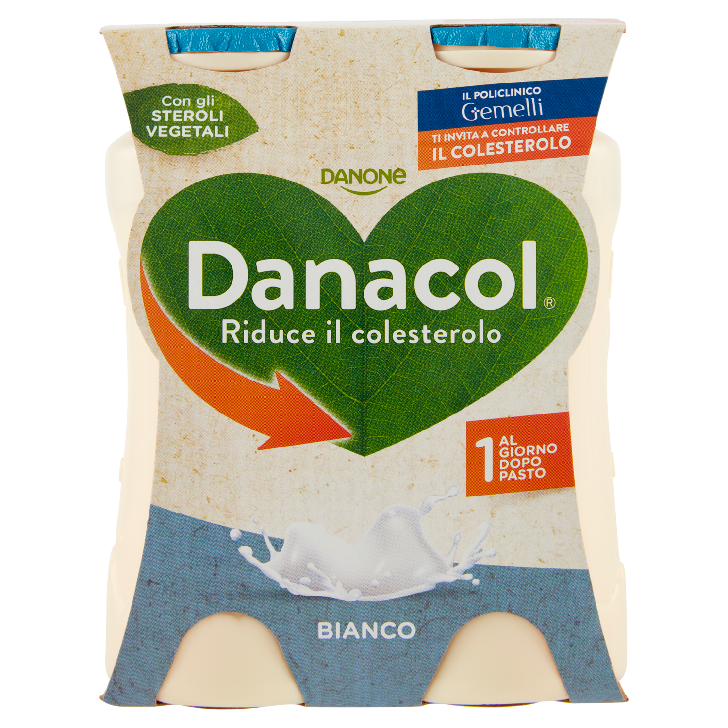 Danacol riduce il colesterolo grazie agli steroli vegetali⁽¹⁾ ⁽¹⁾Il colesterolo può causare problemi al cuore. L'effetto benefico si ottiene con l'assunzione quotidiana di almeno 1,5-3 g di steroli vegetali. 3 Settimane - Risultati già dalla 3° settimana (fino al -10%) Massima efficacia dopo i pasti principali Steroli vegetali di origine 100% naturale No zuccheri aggiunti⁽²⁾ e conservanti ⁽²⁾Contiene naturalmente zuccheri.