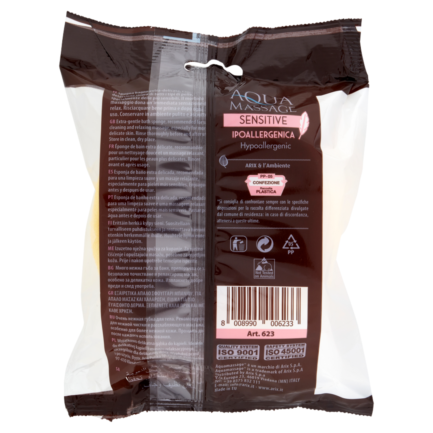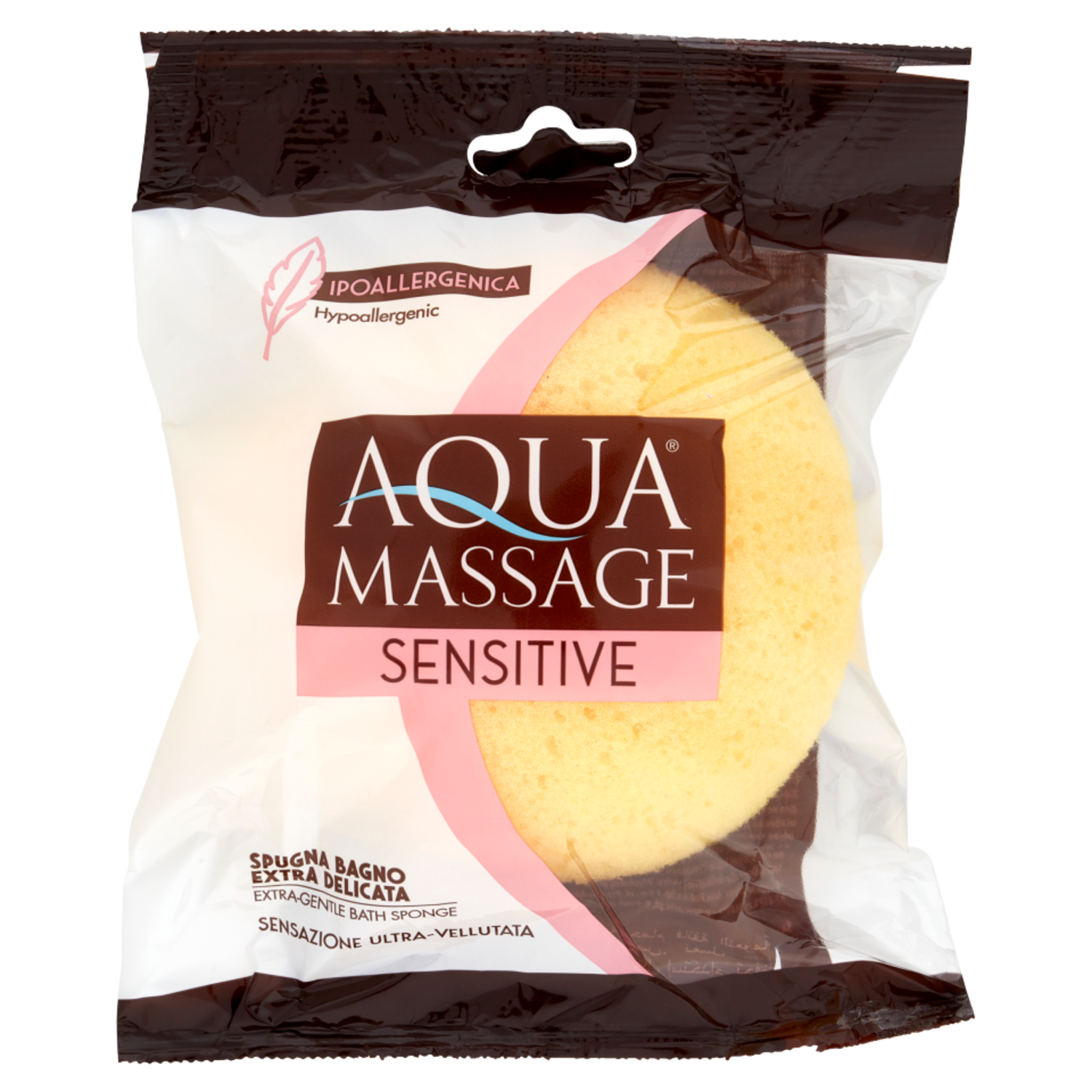 Spugna bagno extra-delicata, l'ideale per la detersione sicura di tutti i tipi di pelle, specialmente delle più sensibili. Il morbido massaggio dona un'immediata sensazione di relax. Aquamassage Sensitive Ipoallergenica