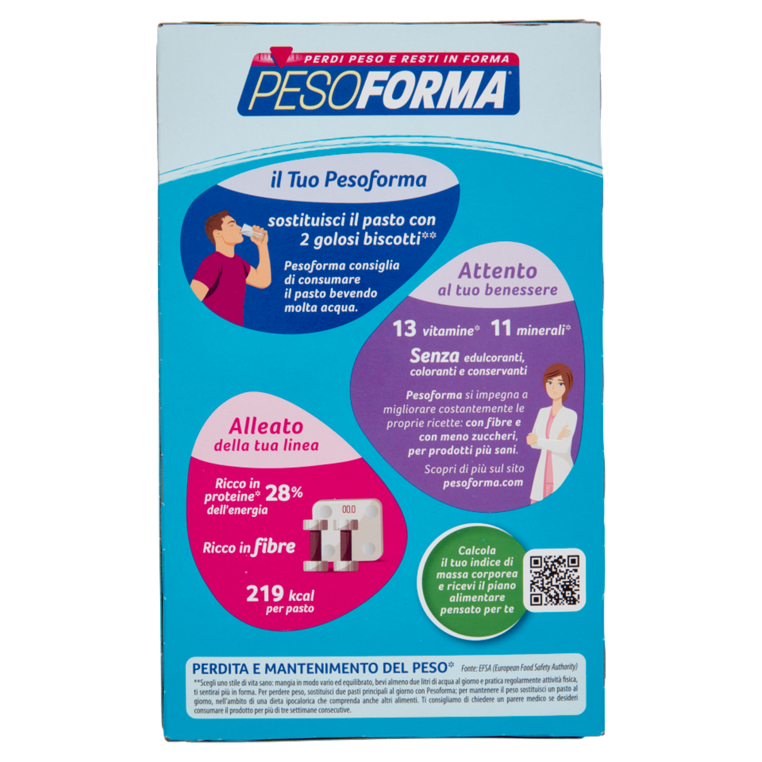 il Tuo Pesoforma sostituisci il pasto con 2 golosi biscotti** Pesoforma consiglia di consumare il pasto bevendo molta acqua. Attento al tuo benessere 13 vitamine* 11 minerali* Senza edulcoranti, coloranti e conservanti Pesoforma si impegna a migliorare costantemente le proprie ricette: con fibre e con meno zuccheri, per prodotti più sani. Scopri di più sul sito pesoforma.com Alleato della tua linea Ricco in proteine* 28% dell'energia Ricco in fibre 219 kcal per pasto Perdita e mantenimento del peso* Fonte: EFSA (European Food Safety Authority) **Scegli uno stile di vita sano: mangia in modo vario ed equilibrato, bevi almeno due litri di acqua al giorno e pratica regolarmente attività fisica, ti sentirai più in forma. Per perdere peso, sostituisci due pasti principali al giorno con Pesoforma; per mantenere il peso sostituisci un pasto al giorno, nell'ambito di una dieta ipocalorica che comprenda anche altri alimenti. Ti consigliamo di chiedere un parere medico se desideri consumare il prodotto per più di tre settimane consecutive. *Valido per i sostituti del pasto per il controllo del peso