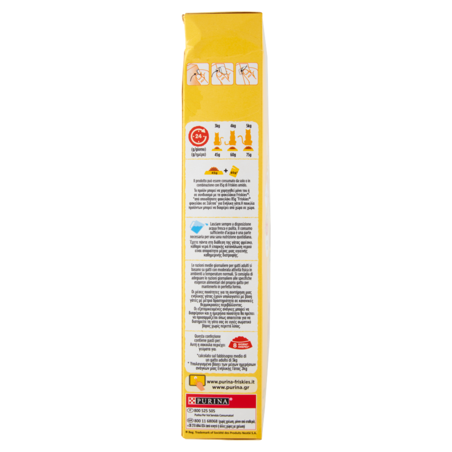 24 (g/giorno) Peso del gatto: 3kg | 45g Peso del gatto: 4kg | 60g Peso del gatto: 5kg | 75g 45g + 85g* Il prodotto può essere consumato da solo o in combinazione con 85 g di Friskies umido. Lasciare sempre a disposizione acqua fresca e pulita. Il consumo sufficiente d'acqua è una parte necessaria per una sana nutrizione quotidiana. Le razioni medie giornaliere per gatti adulti si basano su gatti con moderata attività fisica in ambienti a temperature normali. Si consiglia di adeguare le razioni giornaliere alle specifiche esigenze alimentari del proprio gatto per mantenerlo in perfetta forma. Questa confezione contiene pasti per: 8 giorni* *calcolato sul fabbisogno medio di un gatto adulto di 3kg