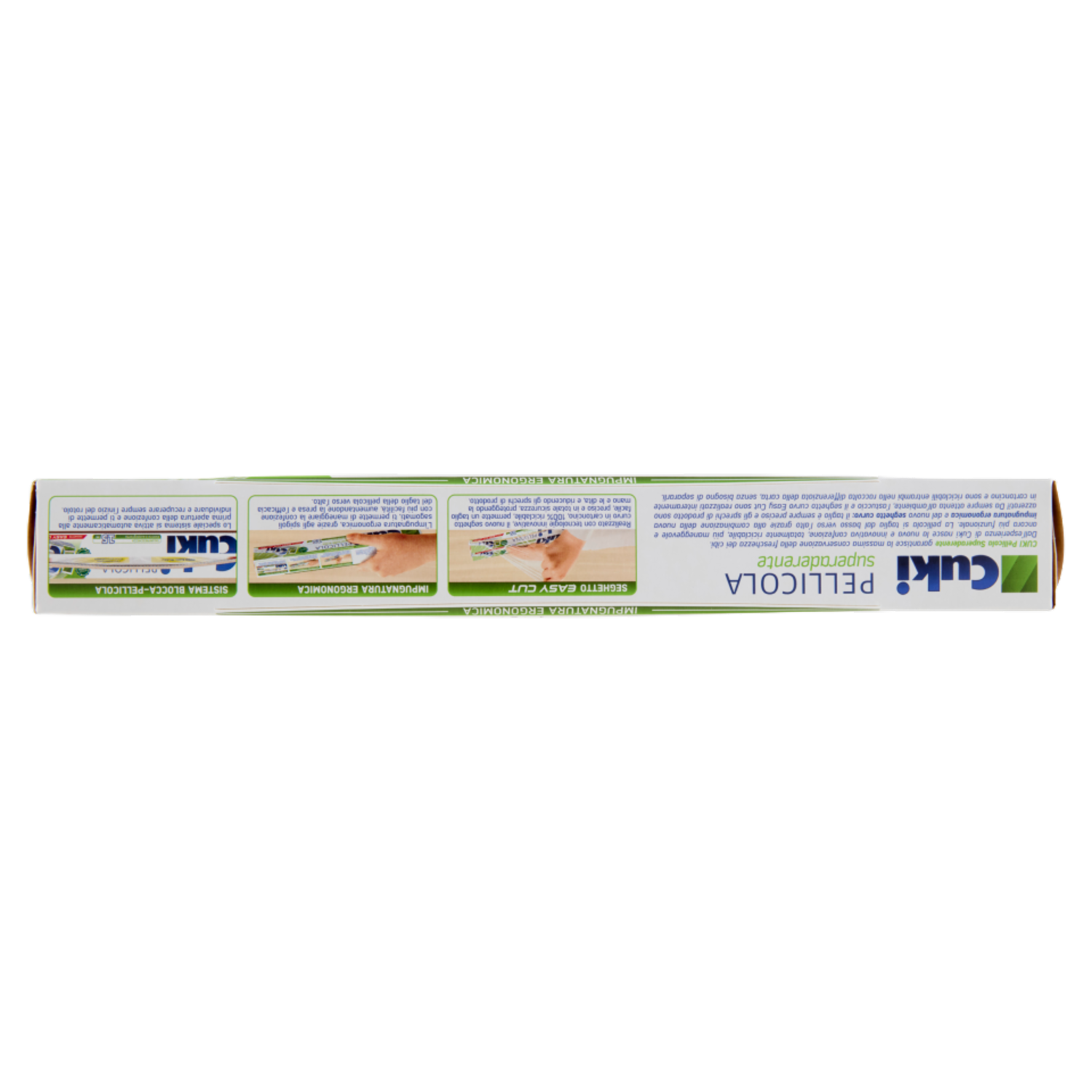 Cuki Pellicola Superaderente garantisce la massima conservazione della freschezza dei cibi. Dall'esperienza di Cuki nasce la nuova e innovativa confezione, totalmente riciclabile, più maneggevole e ancora più funzionale. La pellicola si taglia dal basso verso l'alto grazie alla combinazione della nuova impugnatura ergonomica e del nuovo seghetto curvo: il taglio è sempre preciso e gli sprechi di prodotto sono azzerati! Da sempre attenta all'ambiente, l'astuccio e il seghetto curvo Easy Cut sono realizzati interamente in cartoncino e sono riciclabili entrambi nella raccolta differenziata della carta, senza bisogno di separarli. Seghetto easy cut Realizzato con tecnologie innovative, il nuovo seghetto curvo in cartoncino, 100% riciclabile, permette un taglio facile, preciso e in totale sicurezza, proteggendo la mano e le dita, e riducendo gli sprechi di prodotto. Impugnatura ergonomica L'impugnatura ergonomica, grazie agli spigoli sagomati, ti permette di maneggiare la confezione con più facilità, aumentandone la presa e l'efficacia del taglio della pellicola verso l'alto. Sistema blocca-pellicola Lo speciale sistema si attiva automaticamente alla prima apertura della confezione e ti permette di individuare e recuperare sempre l'inizio del rotolo. Caratteristiche Protettiva e impermeabile: mantiene a lungo la freschezza e il grado di umidità dei tuoi cibi, sia dentro che fuori dal frigorifero. Elastica, autosigillante e superaderente: si conforma perfettamente intorno a qualsiasi tipo di cibo o di contenitore. Massima facilità di utilizzo: nuovo seghetto curvo, nuova impugnatura ergonomica e nuovo sistema blocca-pellicola per un taglio sempre perfetto, una presa sicura per un utilizzo più semplice del prodotto. Non contiene ftalati e BPA.