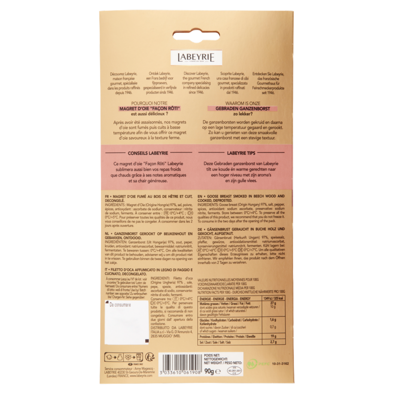 Queste sottili fettine di filetto d'oca affumicato accompagneranno abilment e insalate, fredde o tiepide, così come ogni tipo di antipasto originale.