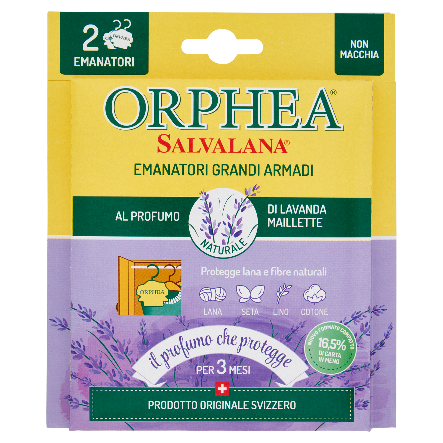 Consigliato da: Piacenza 1733 Gli Emanatori Orphea Salvalana sono realizzati in pura cellulosa imbevuta nell'opificio svizzero del Canton Ticino. Il ricercato bouquet al profumo di Lavanda Maillette è frutto di una sapiente ricerca tra le diverse piante officinali per individuare la composizione di lavande nobili più efficaci per ottenere un profumo che avvolge e protegge a lungo i capi più preziosi (lana, lino, seta, cotone, ecc.) in modo gradevole. Ideali da usare in armadi e cabine armadio. Ogni emanatore agisce efficacemente per 12 settimane (Non lasciare a contatto diretto con i tessuti e con le superfici delle pareti) Questo prodotto è composto di materiale certificato FSC e di altro materiale controllato