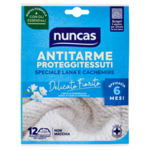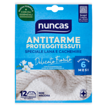 Nuncas Anti Tarme Forte è un antitarme profumato che grazie alla sua formulazione, protegge tutti gli indumenti in lana e cachemire posti negli armadi e nei cassetti. Nuncas Anti Tarme Forte elimina le larve responsabili dei danni ai tessuti e le tarme adulte, così da impedire la deposizione di nuove uova. La sua azione protegge lana, cachemire e le fibre naturali per 6 mesi. Il suo gradevole profumo diffonde una raffinata fragranza sui capi e nei cassetti. Nuncas Anti Tarme Forte è disponibile nei formati foglietti per cassetti e cialde per armadi e cabine armadio in diverse profumazioni. Per la protezione dei tessuti di grandi dimensioni quali tappeti, coperte e tessuti d'arredo utilizzare Nuncas Anti Tarme Forte Spray.