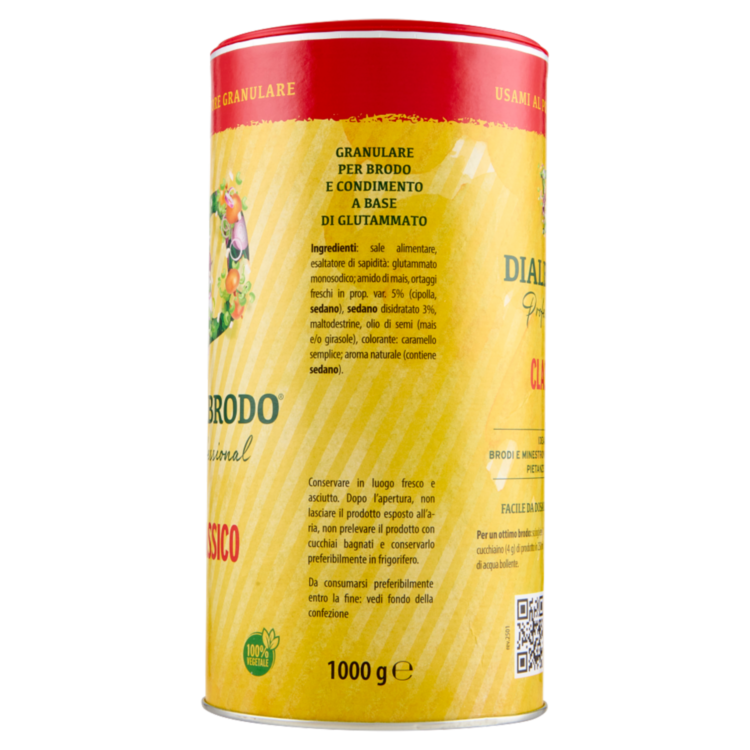 Dialbrodo Classico è il preparato granulare istantaneo vegetale ottenuto a partire da ortaggi freschi disidratati e aromi naturali, pensato per brodi e minestre più gustosi, ma anche per insaporire sughi, contorni, verdure grigliate, carne e pesce. Un amico ai fornelli per rendere più appetitosa la tua tavola! Dal 1960 Dialbrodo è l'amico fidato protagonista della buona tradizione in cucina e da sempre capace di esaltare i piatti più diversi con il suo inconfondibile sapore.