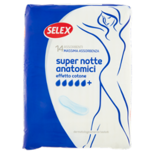 Selex Notte Anatomico con canalini per flussi intensi è realizzato con una particolare miscela di cellulosa e materiale superassorbente, per una piacevole sensazione di asciutto. La sua forma allungata e i suoi canalini conferiscono protezione specialmente durante la notte e con flussi intensi.