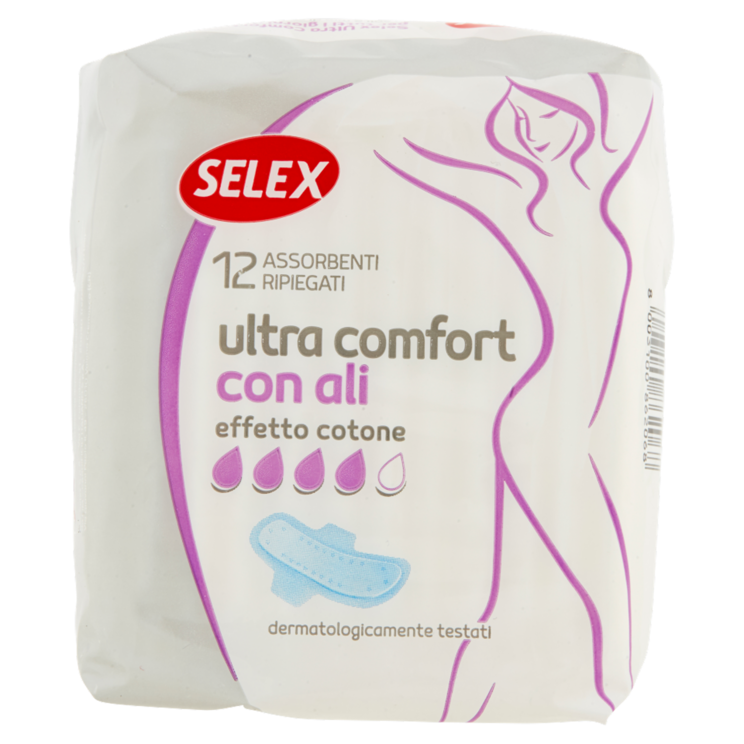 Selex Ultra Comfort con Ali per tutti i giorni del ciclo in soli 2 mm di spessore garantisce assorbenza e comfort. Le comode ali ed il filtrante in tessuto non tessuto offrono protezione e igienicità.