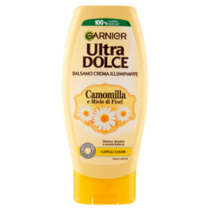 La nostra ricetta illuminante per capelli chiari Garnier Ultra Dolce unisce: - Camomilla, conosciuta per le sue proprietà schiarenti e addolcenti. - Miele di Fiori, noto per le sue proprietà nutrienti. Risultati: I tuoi capelli hanno bellissimi riflessi naturali e una straordinaria luminosità. Perfettamente nutriti senza essere appesantiti, i tuoi capelli sono facili da pettinare e morbidi al tatto.