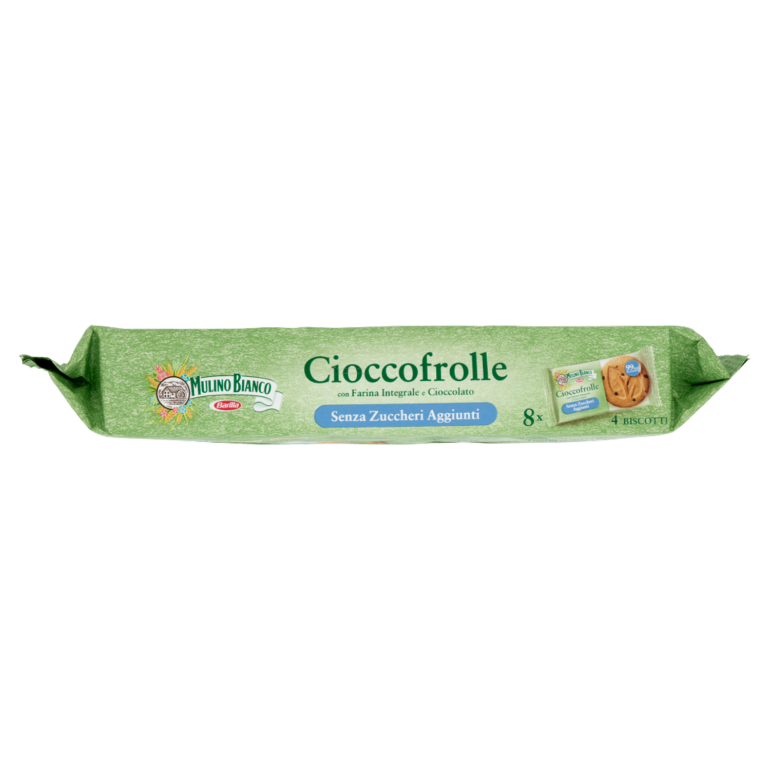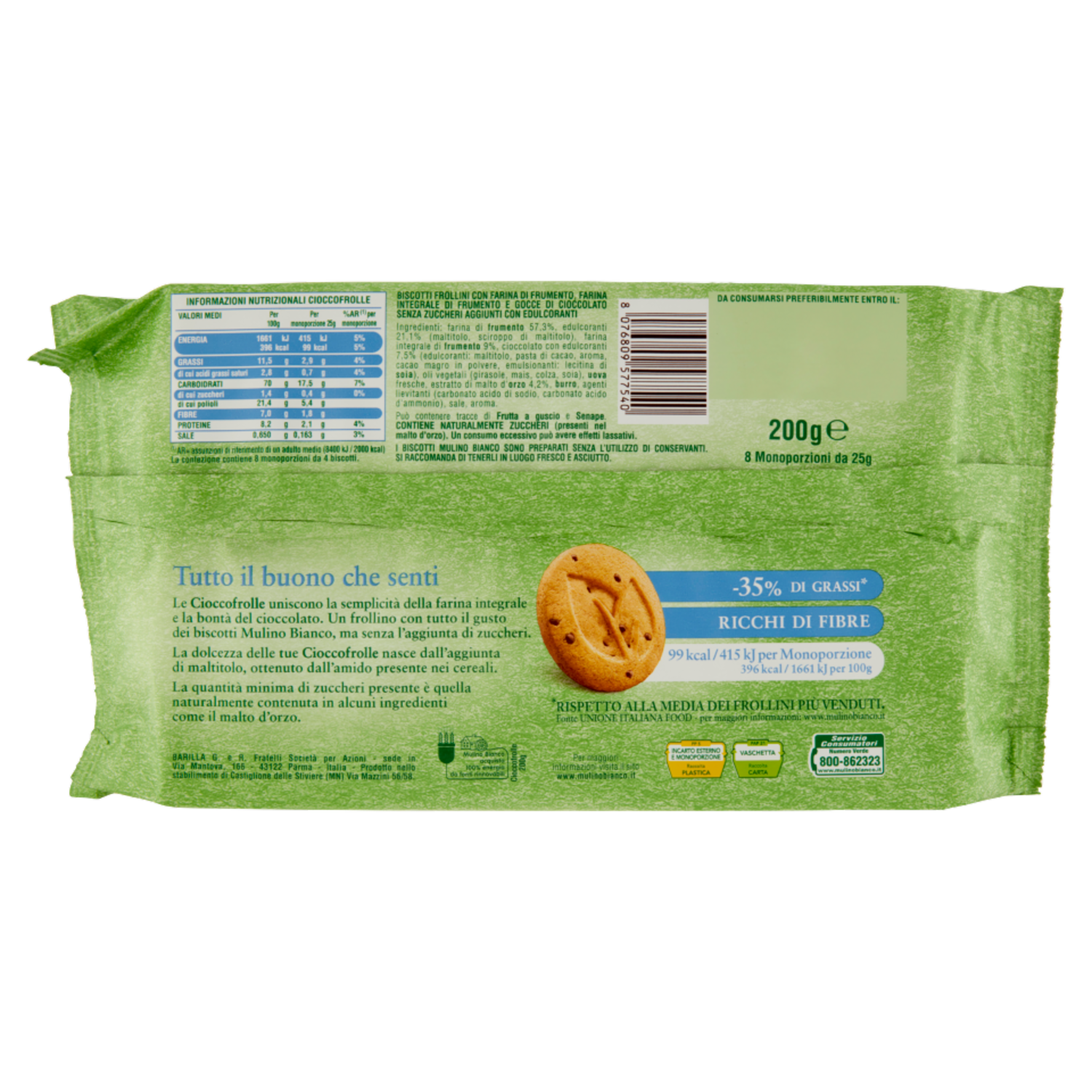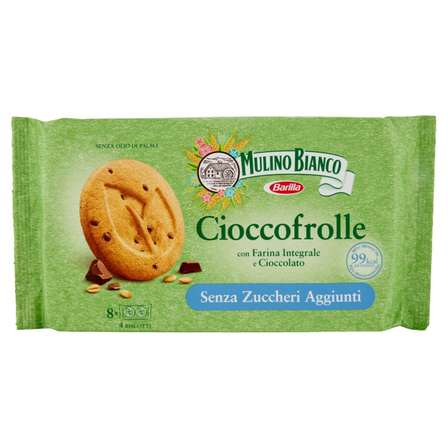 Tutto il buono che senti Le Cioccofrolle uniscono la semplicità della farina integrale e la bontà del cioccolato. Un frollino con tutto il gusto dei biscotti Mulino Bianco, ma senza l'aggiunta di zuccheri. La dolcezza delle tue Cioccofrolle nasce dall'aggiunta di maltitolo, ottenuto dall'amido presente nei cereali. La quantità minima di zuccheri presente è quella naturalmente contenuta in alcuni ingredienti come il malto d'orzo. -35% di grassi* Ricchi di fibre 99 kcal / 415 kJ per Monoporzione 396 kcal / 1661 kJ per 100g *Rispetto alla media dei frollini più venduti. Fonte Unione Italiana Food - per maggiori informazioni: www.mulinobianco.it