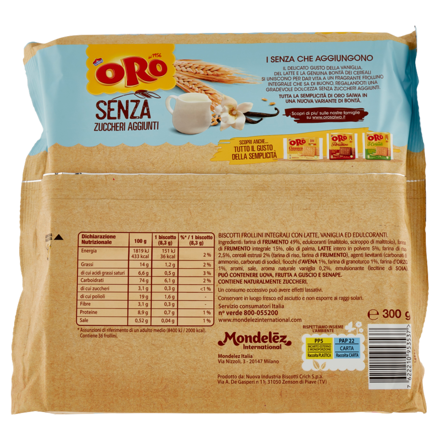 I senza che aggiungono Il delicato gusto della vaniglia, del latte e la genuina bontà dei cereali si uniscono per dar vita a un fragrante frollino integrale che sa di buono, regalandoti una gradevole dolcezza senza zuccheri aggiunti. Tutta la semplicità di Oro Saiwa in una nuova variante di bontà.