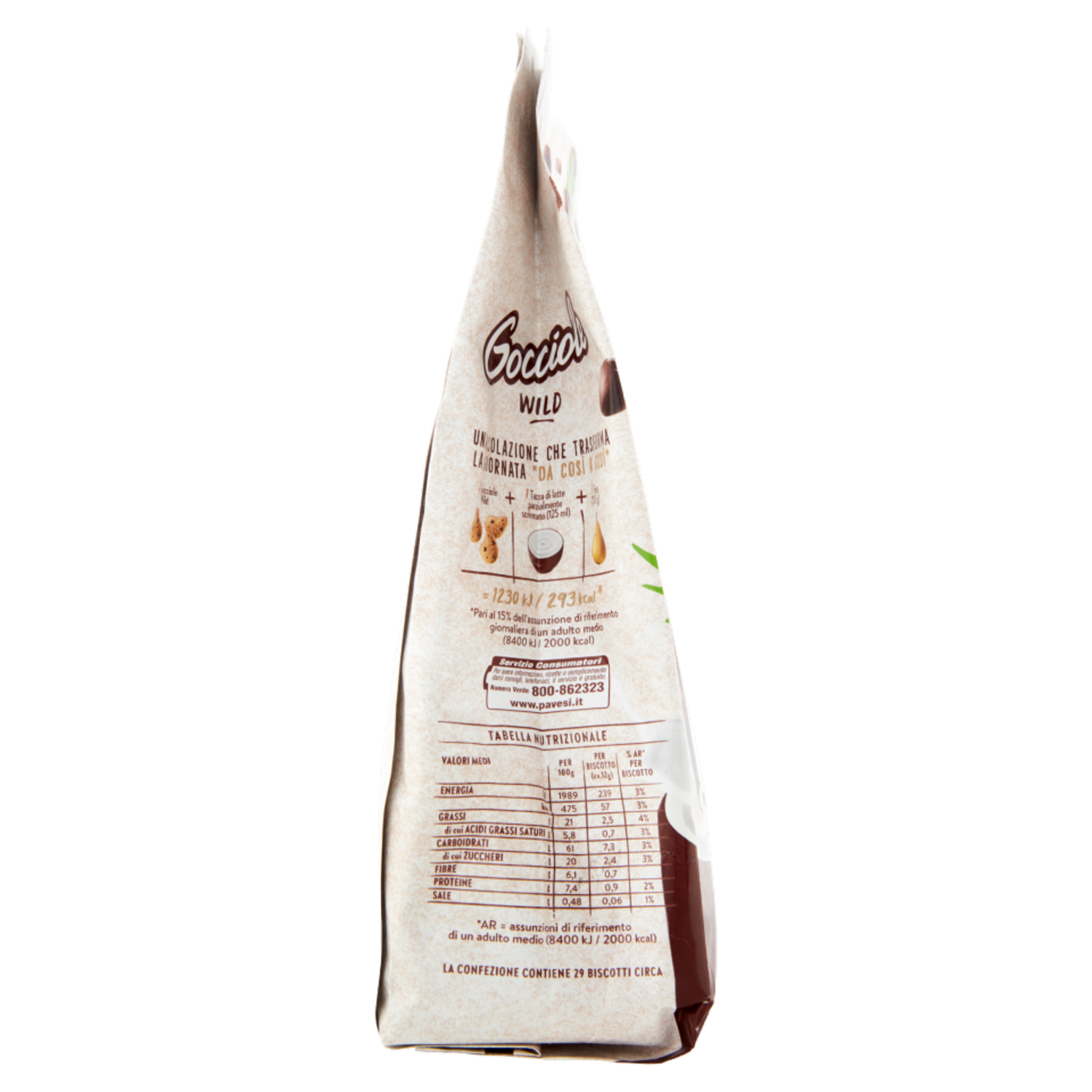 Comincia al meglio la giornata con tutto il gusto e l'energia delle gocciole wild Tante gocce di Cioccolato Fondente e una gustosa pastafrolla fatta anche con Farina Integrale: questo è il segreto delle Gocciole Wild. Perfette a colazione, ideali per l'inzuppo! Tutte le Gocciole sono senza Olio di Palma. Una colazione che trasforma la giornata "da così a così" 3 Gocciole Wild + 1 Tazza di latte parzialmente scremato (125 ml) + 1 Pera (150 g) = 1230 kJ / 293 kcal * *Pari al 15% dell'assunzione di riferimento giornaliera di un adulto medio (8400 kJ / 2000 kcal)