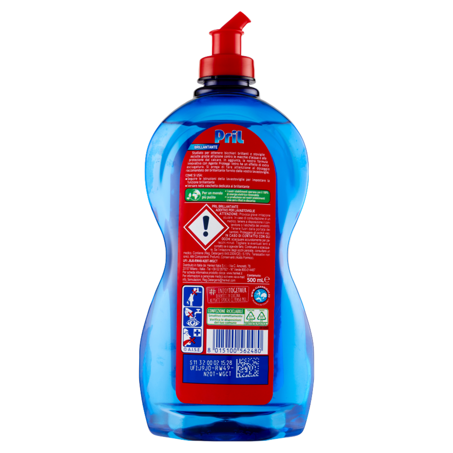 Pril brillantante additivo per lavastoviglie ATTENZIONE: Provoca grave irritazione oculare. In caso di consultazione di un medico, tenere a disposizione il contenitore o l'etichetta del prodotto. Tenere fuori dalla portata dei bambini. Proteggere gli occhi/il viso. IN CASO DI CONTATTO CON GLI OCCHI: sciacquare accuratamente per parecchi minuti. Togliere le eventuali lenti a contatto se è agevole farlo. Continuare a sciacquare. Se l'irritazione degli occhi persiste, consultare un medico. UFI: J9J0-RW49-N20T-WGCT A.I.S.E.