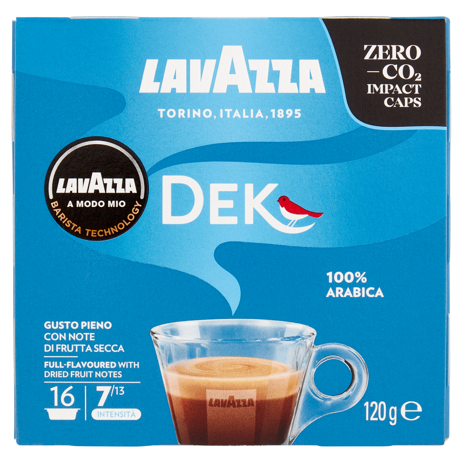 16 capsule monodose di caffè macinato, confezionate in atmosfera protettiva , non vendibili singolarmente. Caffè macinato decaffeinato. Caffeina non su eriore allo 0,10%. Le capsule Lavazza A Modo Mio funzionano esclusivamente on il sistema espresso Lavazza A Modo Mio.