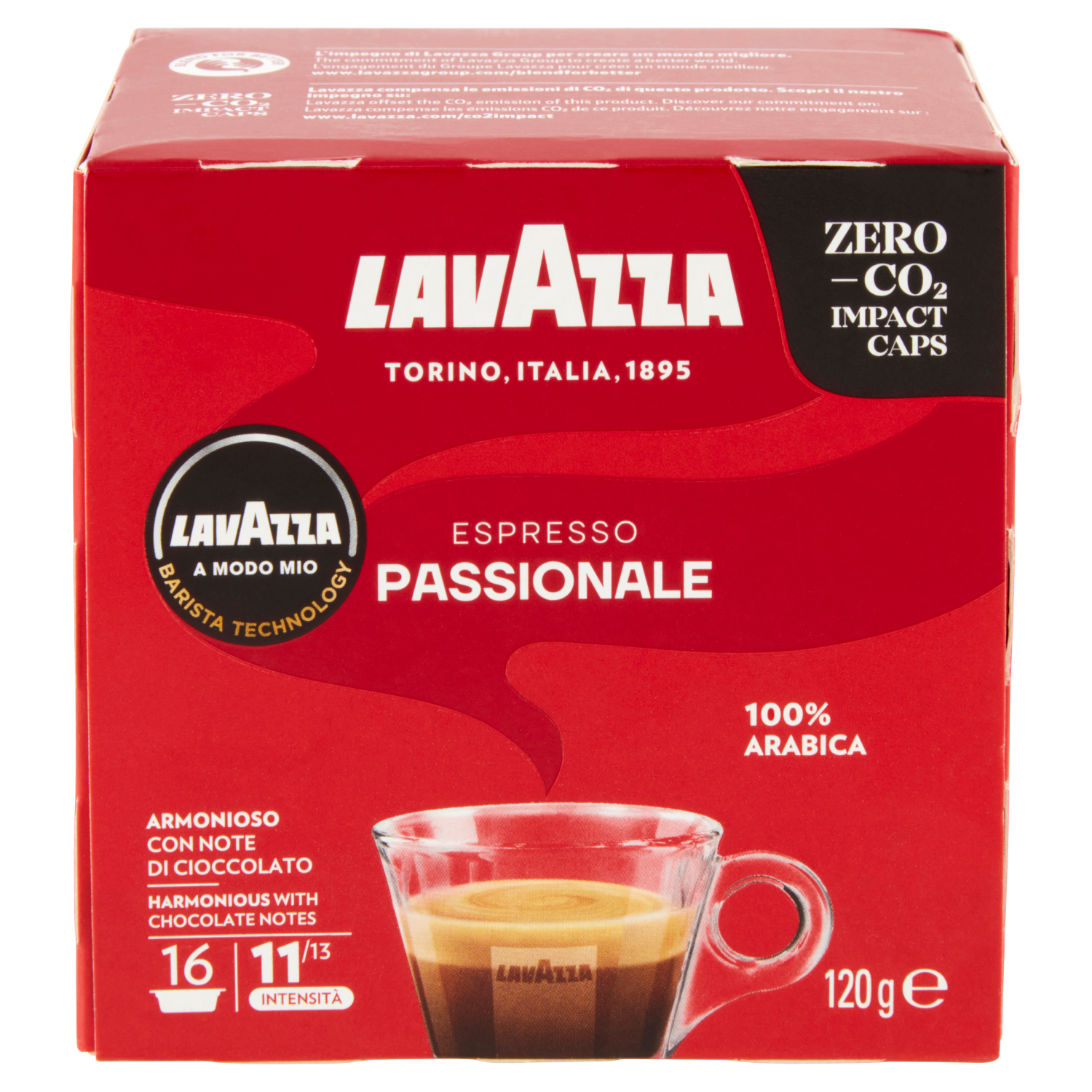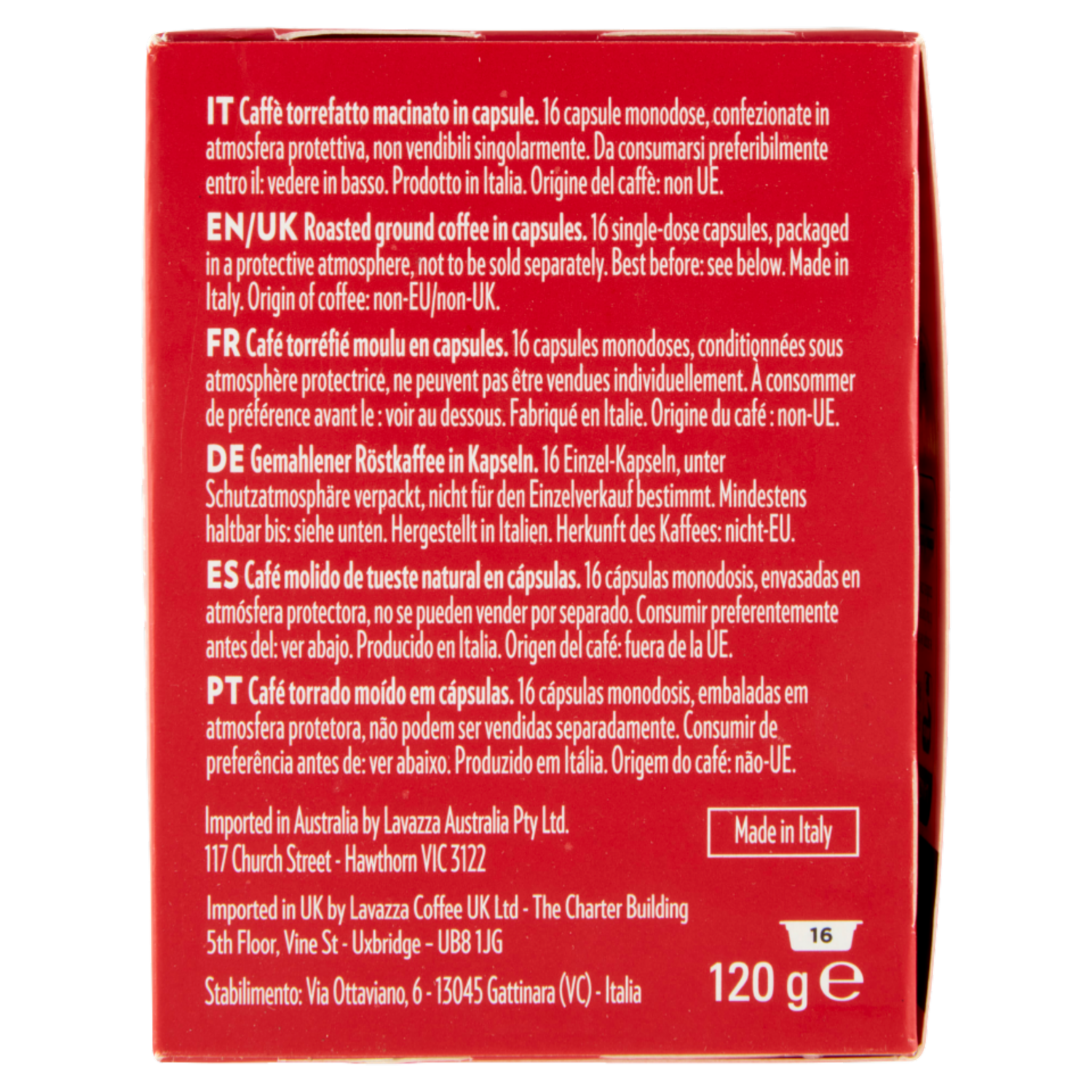 16 capsule monodose di caffè macinato, confezionate in atmosfera protettiva , non vendibili singolarmente. Le capsule Lavazza A Modo Mio funzionano es lusivamente con il sistema espresso Lavazza A Modo Mio.
