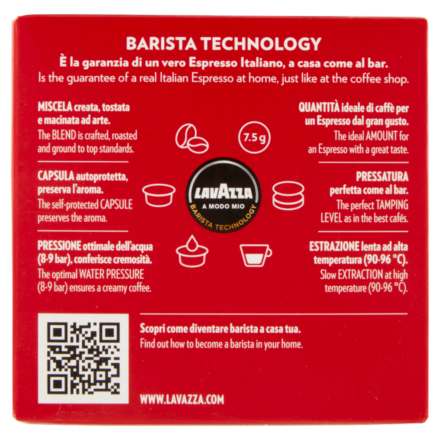 Barista technology È la garanzia di un vero Espresso Italiano, a casa come al bar. Miscela creata, tostata e macinata ad arte. Capsula autoprotetta, preserva l'aroma. Pressione ottimale dell'acqua (8-9 bar), conferisce cremosità. Quantità ideale di caffè per un Espresso dal gran gusto. Pressatura perfetta come al bar. Estrazione lenta ad alta temperatura (90-96 °C). Scopri come diventare barista a casa tua. www.lavazza.com