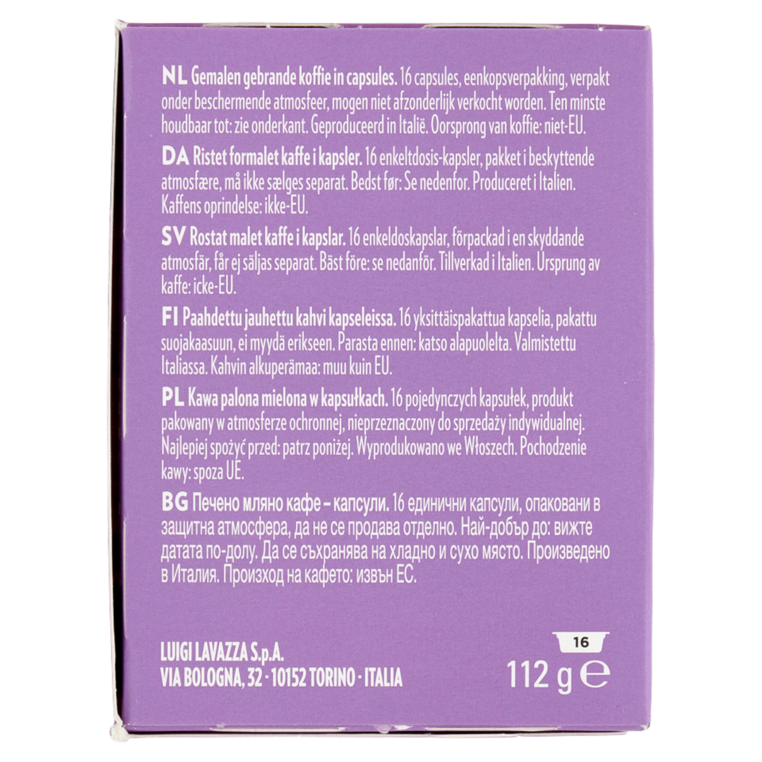 16 capsule monodose di caffè macinato, confezionate in atmosfera protettiva , non vendibili singolarmente. Le capsule Lavazza A Modo Mio funzionano es lusivamente con il sistema espresso Lavazza A Modo Mio.