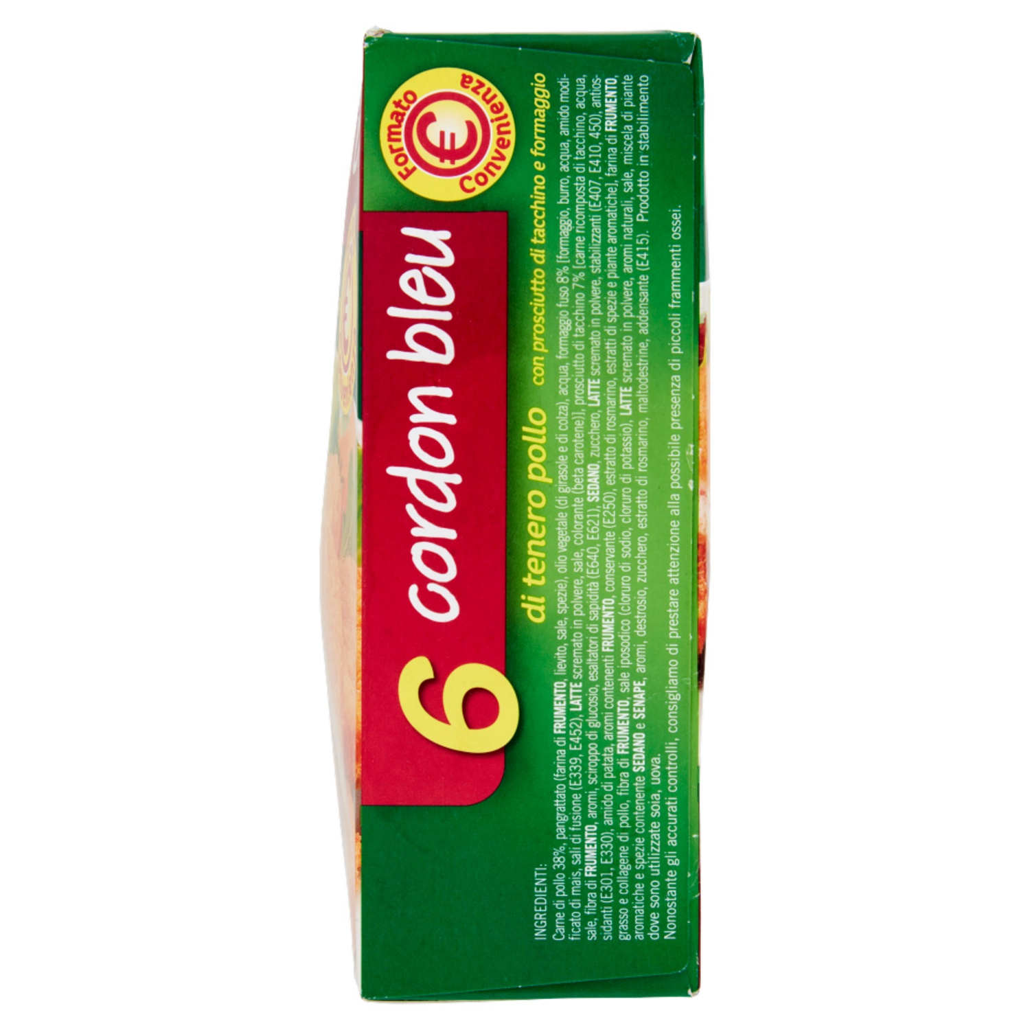 Preparazione alimentare a base di carne di pollo, costituita da parti di carne, con formaggio e prosciutto di tacchino, impanata, cotta e surgelata. Prodotto cotto ad una temperatura a cuore di almeno 70°C