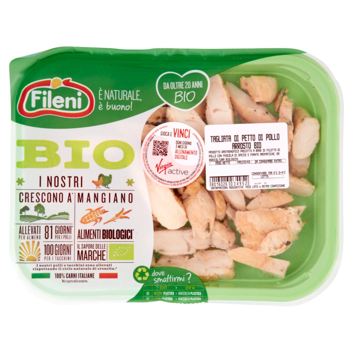 Tagliata di petto di pollo arrosto bio Prodotto gastronomico precotto a base di filetto di pollo con miscela di spezie e piante aromatiche. Da agricoltura biologica